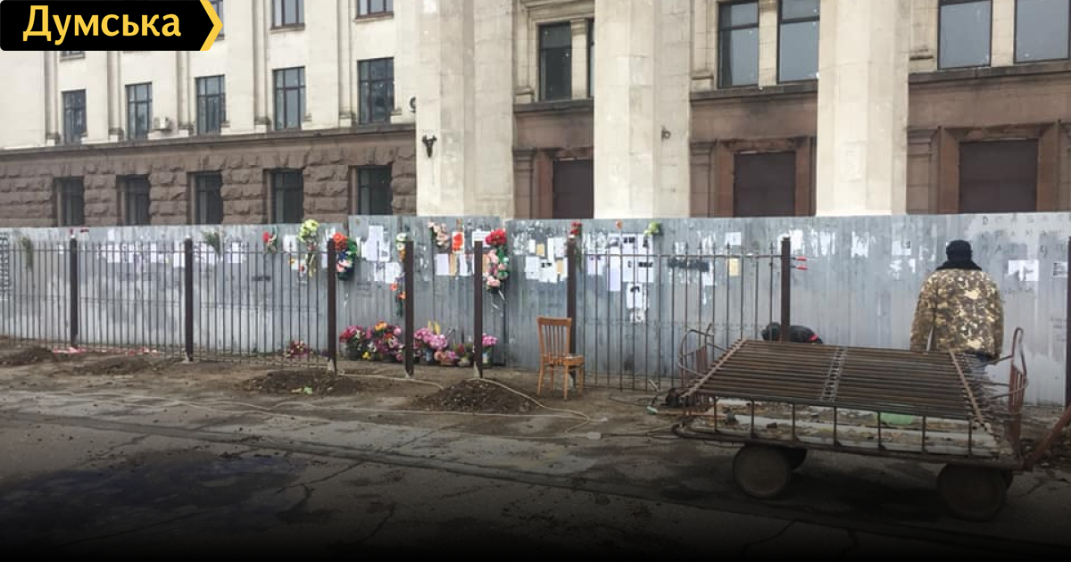 «Забор же должен быть? Установим новый забор, а старый из профнастила демонтируем, чтобы было красиво, эстетично», — говорит функционер. Зачем в принципе нужен забор вокруг здания, он не пояснил. Вячеслав Буратынский добавил, что ремонт в Доме профсоюзов продолжается, «но не такими темпами, как нам хотелось бы, так как есть проблемы с финансированием». Отметим, что здание на Куликовом поле оградили через 18 дней после страшного пожара, унесшего 42 человеческие жизни. Единомышленники погибших участников событий 2 мая с пророссийской стороны используют ограду в качестве стены памяти — на ней регулярно появляются фотографии, цветы, записки соответствующего содержания. Фото — Демьян Ганул