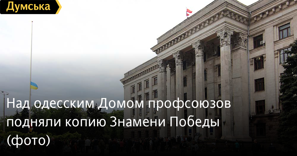 Одесситы, собравшиеся сегодня на Куликовом поле почтить память погибших в Великой Отечественной войне и в столкновениях 2 мая, подняли над зданием сгоревшего Дома профсоюзов копию Знамени Победы.
