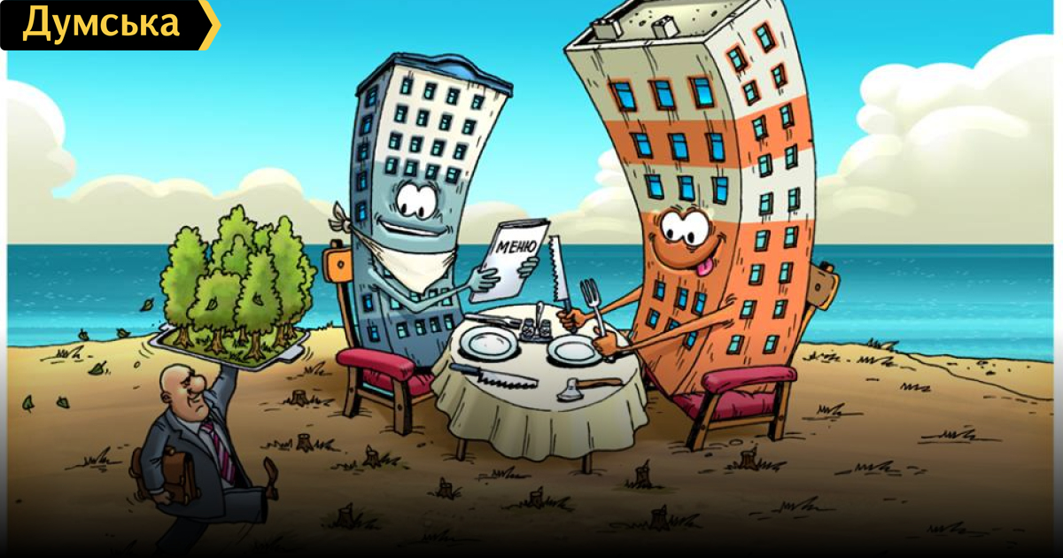 Карикатуристы «Думской» Александр Бронзов и Игорь Жеведь изучили градостроительную политику «отцов» нашего города за последние 20 лет и проиллюстрировали ее одной картинкой. СМЕРТЬ РОСІЙСЬКИМ ОКУПАНТАМ! Помітили помилку? Виділяйте слова з помилкою та натискайте control-enter Новини по цій темі: 6 листопада 2024: Спроба №... Готель-барак на схилі 13-го Фонтану в Одесі все ж визнали незаконним, але боротьба за нього триває 26 листопада 2024: Через кримінальне провадження до продажів: узаконений нахаббуд на одеському узбережжі перетворюється на елітний житловий комплекс (фото) 30 вересня 2024: Одеська прокуратура наполягає на перегляді великої земельної приватизації часів Гурвіца: вимагає повернути землю біля моря 29 липня 2024: Власники закладів в одеській Отраді стверджують, що вже знесли літній майданчик, який збиралася демонтувати мерія (фото) 25 липня 2024: Мерія Одеси хоче демонтувати літні майданчики на Ланжероні та в Отраді: екснардеп зніс усе сам (обновлено) |