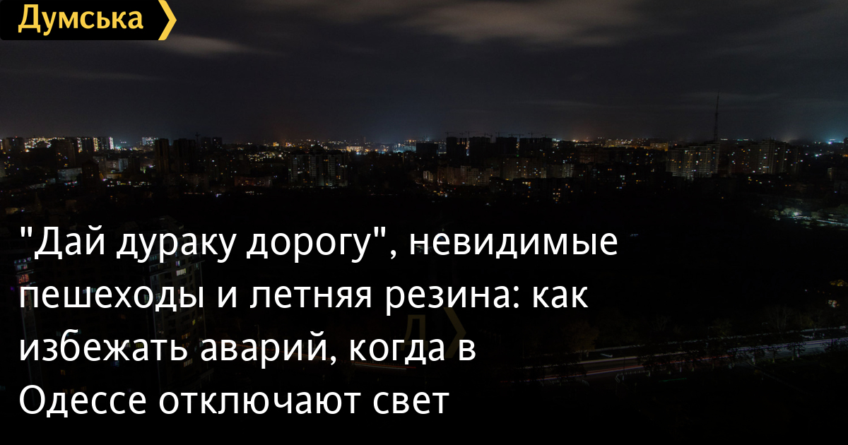 «Дай дураку дорогу», невидимые пешеходы и летняя резина: как избежать аварий, когда в Одессе отключают светКогда в Одессе гаснет свет, даже привычные маршруты становятся непредсказуемыми: проезжую часть сложнее разглядеть, люди появляются из темноты, а перекрестки превращаются в зоны повышенного риска. «Думская» выяснила, где в городе самые опасные участки и какие советы помогут водителям и пешеходам безопасно передвигаться во время блэкаута. В минувшие выходные вечером на темном перекрестке улиц Владислава Бувалкина (бывшая Бочарова) и Владимира Великого (Добровольского), фура сбила 25-летнего мужчину на нерегулируемом перекрестке. Его госпитализировали с тяжелыми травмами, однако последствия могли быть куда более трагичными. В патрульной полиции нам рассказали, что отдельную статистику ДТП во время блэкаутов не ведут, но в городе есть участки, которые особенно опасны. Это Среднефонтанская площадь, пересечение проспектов Шевченко и Леси Украинки, улиц Канатной и Успенской, проспекта Небесной Сотни и улицы Левитана, а также участок дороги возле лагеря «Молодая Гвардия». Спикер ведомства Алла Марченко сообщила, что во время отключений света регулировщики работают на 25 ключевых перекрестках города. В случае затруднения движения или разрядки аккумуляторов на светофорах, патрульные выезжают и на другие точки, чтобы управлять трафиком «в ручном режиме». Если одесские автомобилисты постепенно адаптировались к темноте и стали внимательнее на дорогах, то пешеходы к таким экстремальным условиям оказались готовы гораздо меньше. «Многие из них продолжают бегать через дорогу, не соблюдая элементарных мер безопасности. Стоит напомнить, что на многих перекрестках и пешеходных переходах во время блэкаутов не работают светофоры, отключено уличное освещение, и водители двигаются в условиях ограниченной видимости. Поэтому крайне важно, чтобы на одежде пешеходов было как можно больше светоотражающих элементов. Переходить дорогу нужно только в установленных местах и включать фонарики в мобильных телефонах!», – рассказала Марченко. Одесский автоинструктор Виталий Базук составил для читателей «Думской» свод правил выживания на дорогах, которые помогут водителям и пешеходам избежать фатальных ошибок во время блэкаута. «В первую очередь нужно уметь пользоваться дорожными знаками и правилами дорожного движения – это основа основ, – отмечает инструктор. – Очень важно отказаться от агрессивного стиля езды и четко соблюдать скоростной режим, тем более сейчас зима и скользко. Помним, что любой транспорт не может остановиться мгновенно – даже после экстренного торможения он проедет еще. Подъезжая к пешеходному переходу и любому перекрестку, снижаем скорость до 20 километров в час. Соблюдаем дистанцию между автомобилями! И помним про неписанное правило – «Уступи дураку дорогу». Многие пешеходы переходят дорогу, не глядя по сторонам, не пользуются светоотражающими элементами и не подсвечивают фонариками. Водители обязаны помнить обо всем этом – лучше перестраховаться лишний раз». От себя – автора-водителя с 35-летним стажем, добавлю пару личных рекомендаций. Зимний блэкаут намного сложней чем, в любой другой сезон. Поэтому утром, выводя свой автомобиль на дорогу, стоит проверить – очищены ли от снега и льда все фонари и поворо