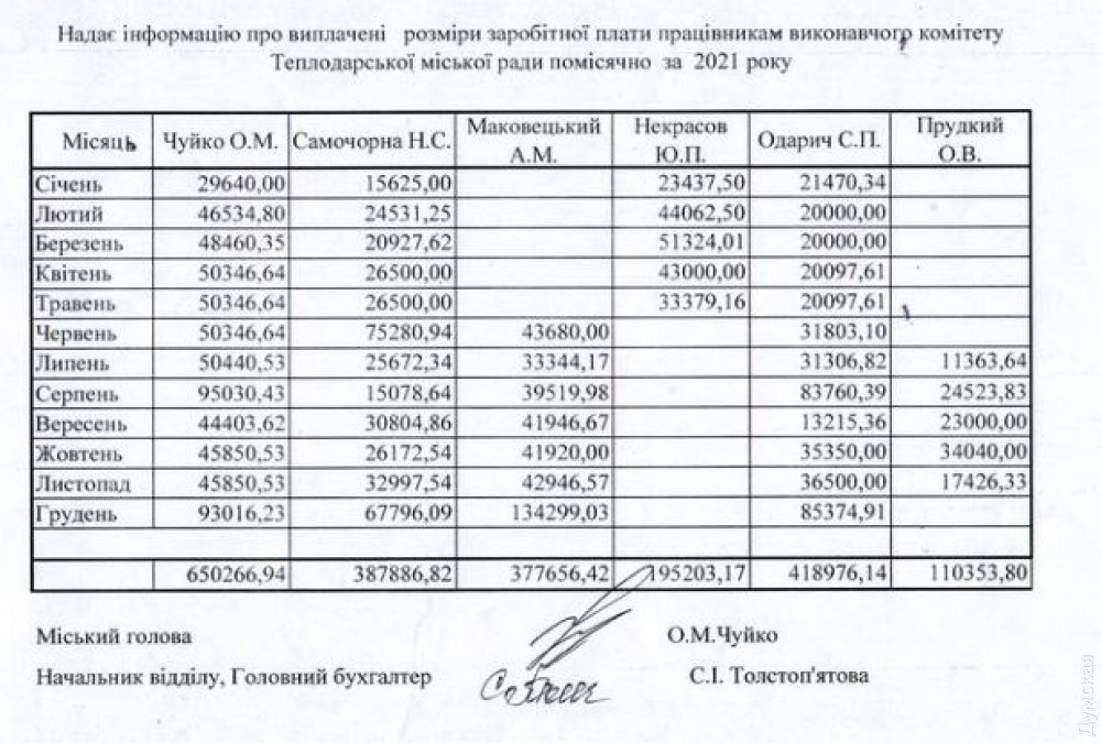 Городской голова Теплодара Александр Чуйко вместе с заместителями Андреем Маковецким, Юрием Некрасовым, Светланой Одарич, Александром Прудким и секретарем горсовета Натальей Самочорной за год заработали 1,7 млн грн. Об этом сообщил депутат горсовета Илья Ильин.