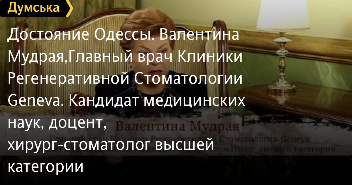 Достояние Одессы. Валентина Мудрая,Главный врач Клиники Регенеративной Стоматологии Geneva. Кандидат медицинских наук, доцент, хирург-стоматолог высшей категории