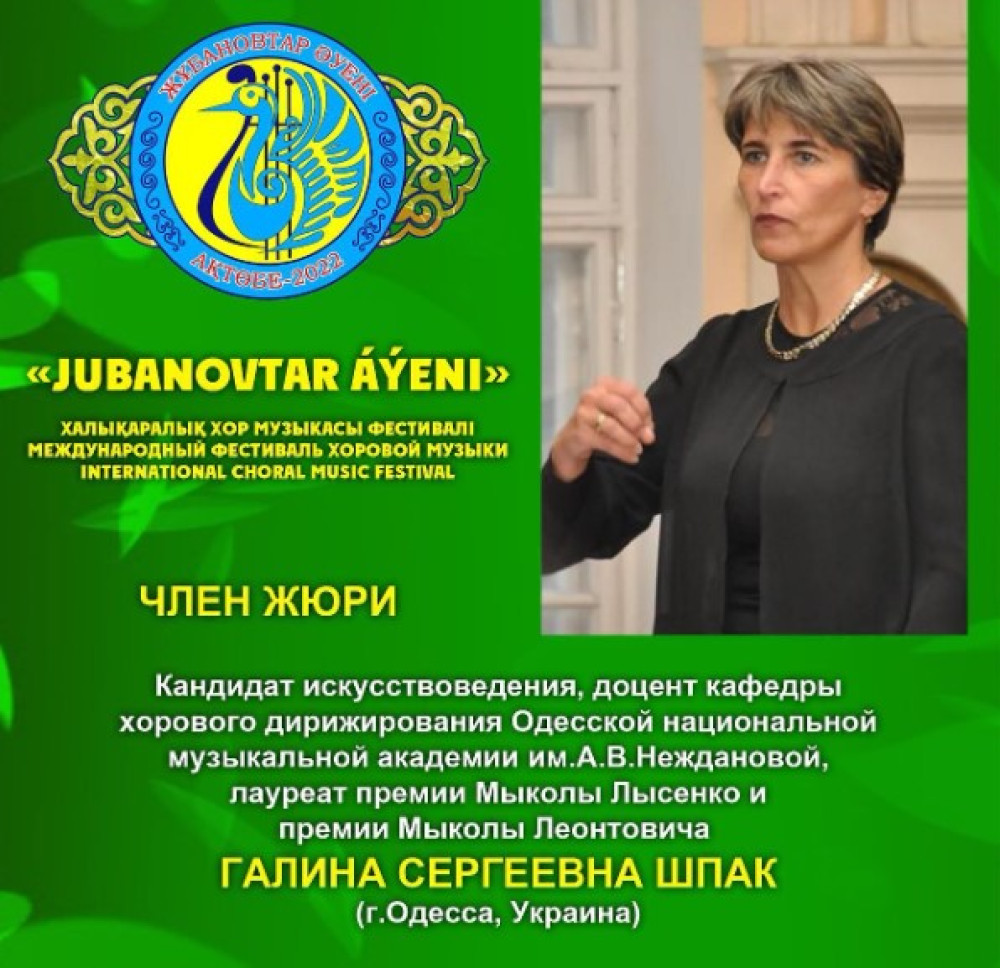 Художній керівник студентського хору Одеської музичної академії ім. А.В. Нежданової, доцент кафедри хорового диригування Галина Шпак увійшла в склад журі міжнародного фестивалю-конкурсу хорової музики JUBANOVTAR AYENI -2022, який відбувся у місті Актобе (Казахстан) наприкінці жовтня.
