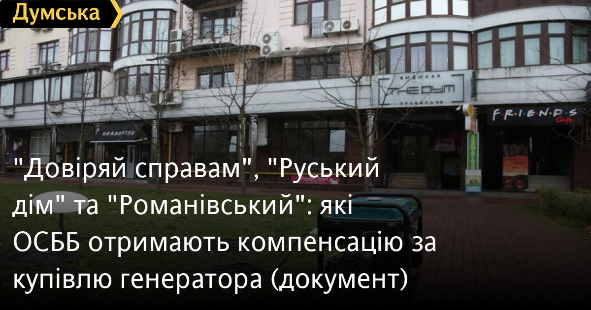 «Довіряй справам», «Руський дім» та «Романівський»: які ОСББ отримають компенсацію за купівлю генератора (документ)Ще шість ОСББ отримають загалом майже 400 тисяч гривень компенсації за купівлю генератора. Про це свідчить розпорядження міського голови Геннадія Труханова №45 від 7 лютого. Від трохи понад 40 тисяч гривень до максимально можливих 100 тисяч отримають ОСББ «Романівський», ОСББ «Марсель-44», ОСББ «Довіряй справам», ОСББ «Одисей 34», ОСББ «Руський Дім» та ОСББ «Гранд Парк 24». Нагадаємо, перші шість об'єднань співвласників багатоквартирних будинків отримали загалом 409 тис. 300 грн компенсації. Нагадаємо, рішення про компенсацію 70% вартості генераторів, що закуповуються об'єднаннями співвласників, ухвалила на сесії 30 листопада Одеська міськрада. Суть програми проста — ОСББ купує генератор, потім звертається до райадміністрації з усіма чеками і документами та отримує компенсацію 70% вартості (але не більше 100 тис. грн на будинок). За такі гроші можна придбати генератор, який живитиме котельню, помпи для води, і, можливо, ліфт. Також його вистачить, щоб мешканці могли зарядити телефони. СМЕРТЬ РОСІЙСЬКИМ ОКУПАНТАМ! Помітили помилку? Виділяйте слова з помилкою та натискайте control-enter |