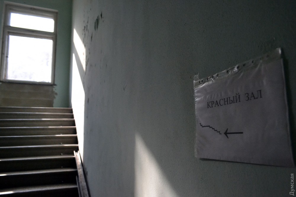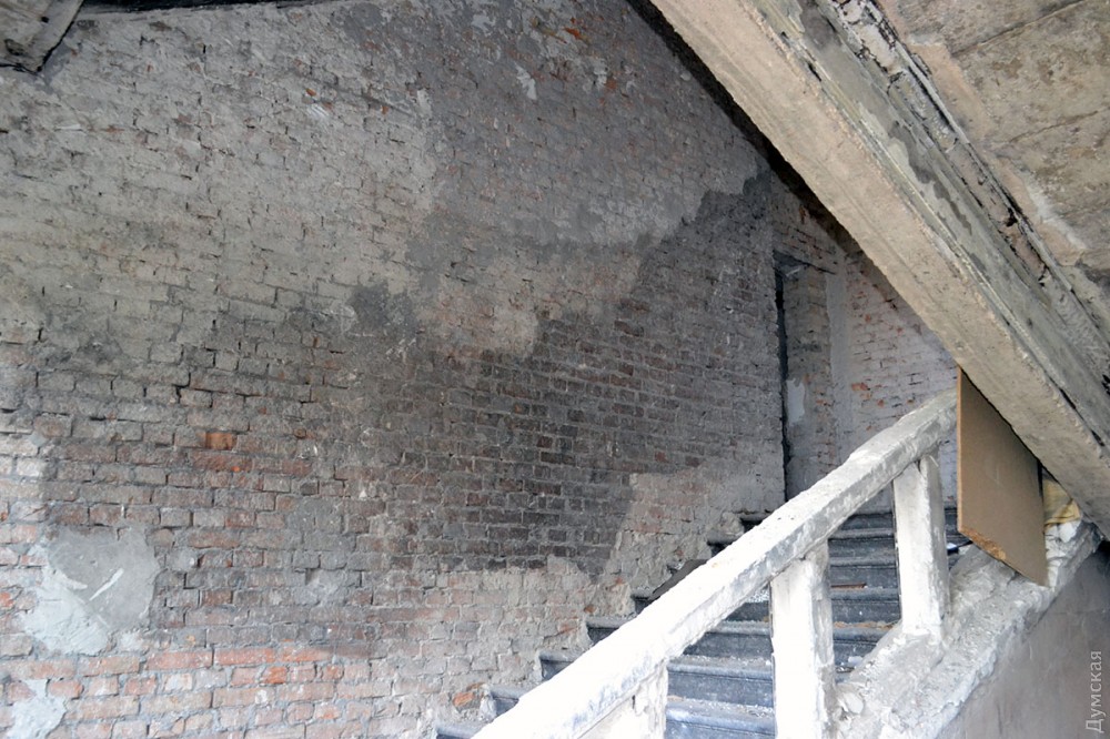 Поднимаемся на второй этаж центральной части. Здесь ремонт только начинается: гранитные ступени изрядно выщерблены, а на лестничной площадке сложен строительный мусор. Стены коридора второго этажа уже оббиты до кирпичной кладки, везде пыль.
