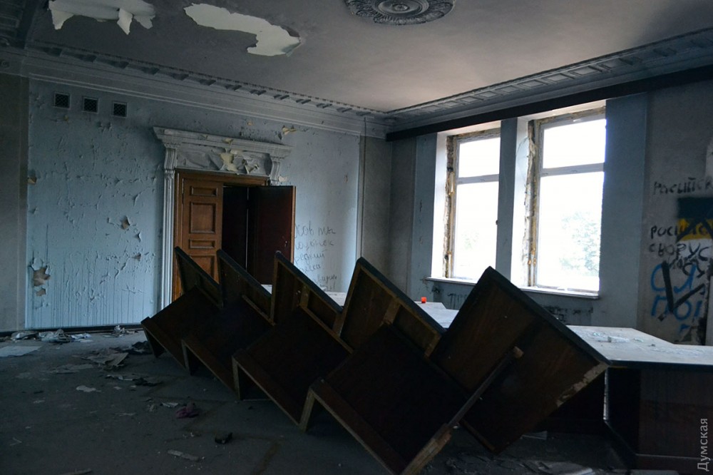 В одном из кабинетов лежит старая мебель, а о событиях трехгодичной давности напоминает только битое стекло на полу и надписи представителей противоборствующих сторон на стенах.