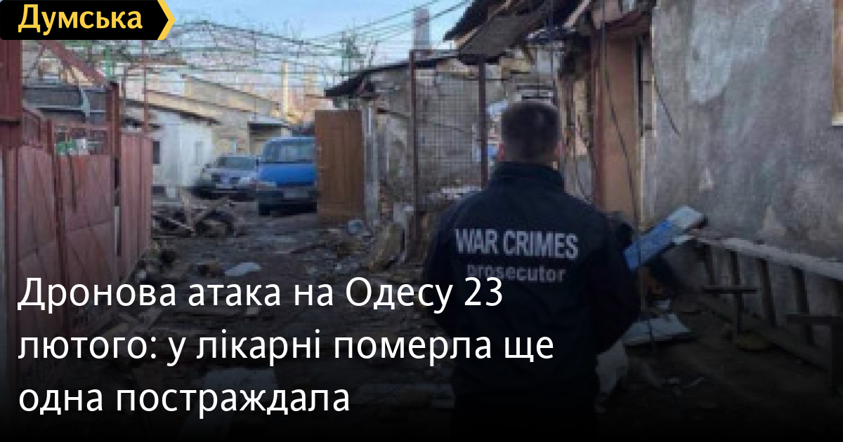61-річна жінка, яка постраждала внаслідок дронового удару по Одесі ввечері 23 лютого, померла в лікарні.