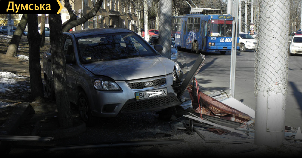 Машина врезалась в ситилайт, сообщающий о том, что «Одесса — улыбка бога». К счастью, кроме автомобиля и рекламной конструкции, никто не пострадал.