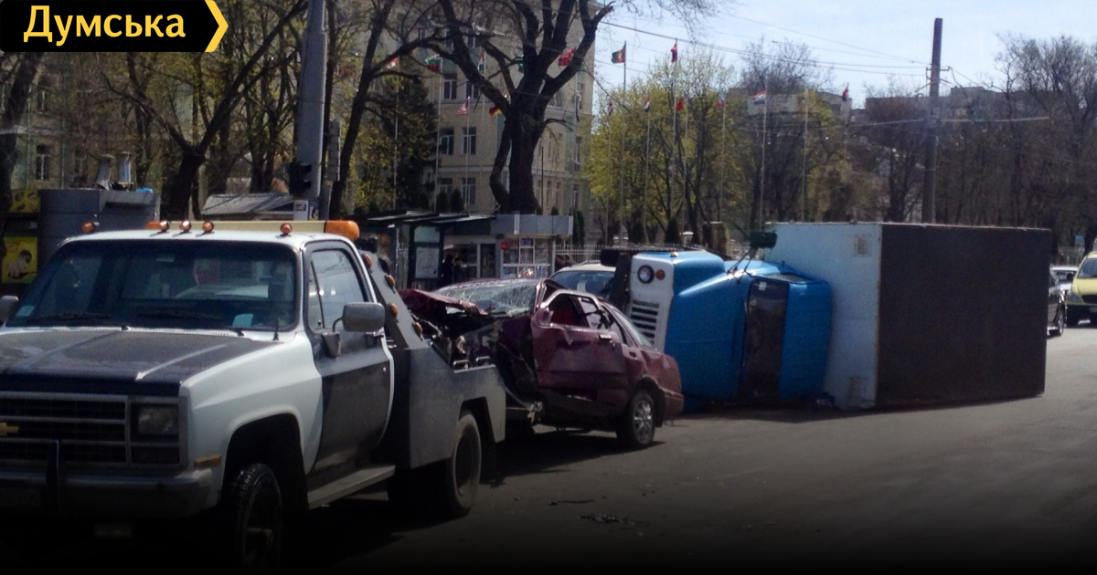 сообщение из «Одесского форума»: «На 5-ой Фонтана ГАЗон-хлебовозка на боку и старенький Галант, по-моему, без морды. Кто откуда ехал, сразу и не поймешь». но я лично вообще не знаю, как в той куче определить, что это.