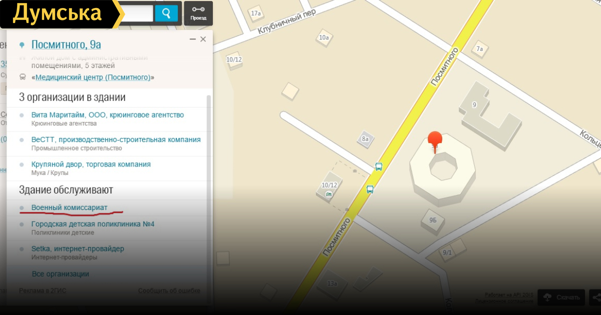 Теперь, если кликнуть по любому жилому дому, то в разделе «здание обслуживают», кроме интернет-провайдеров, мобильных операторов и ЖКСа, появляется еще и ссылка на районный военкомат, причем она размещена первой.