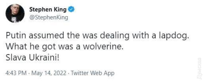 Думал Украина «болонка», а оказалась «росомахой», — Стивен Кинг высмеял путинаАмериканский писатель Стивен Кинг восхитился мужеством украинцев и сравнил нашу страну с росомахой. «Король ужасов» считает, что президент рф недооценил Украину, решив развязать войну. «Путин думал, что имеет дело с болонкой. Оказалось, что это была росомаха. Слава Украине!» — написал знаменитый американец в своем Твиттере. Кинг не первый раз поддерживает Украину. Ранее писатель отказался издавать свои книги в рф. Также он появлялся в футболке в сине-желтым принтом. СМЕРТЬ РОСІЙСЬКИМ ОКУПАНТАМ! Помітили помилку? Виділяйте слова з помилкою та натискайте control-enter |