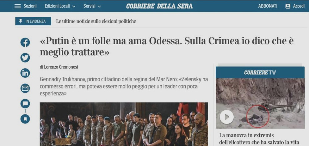 Начнем с первой части скандального заголовка: «Путин — дурак, но он любит Одессу» (в оригинале: Putin è un folle ma ama Odessa). Вы удивитесь: несмотря на то, что эта фраза взята в кавычки и подается как прямая речь Труханова, на самом деле, он не говорил ни первого, ни второго.