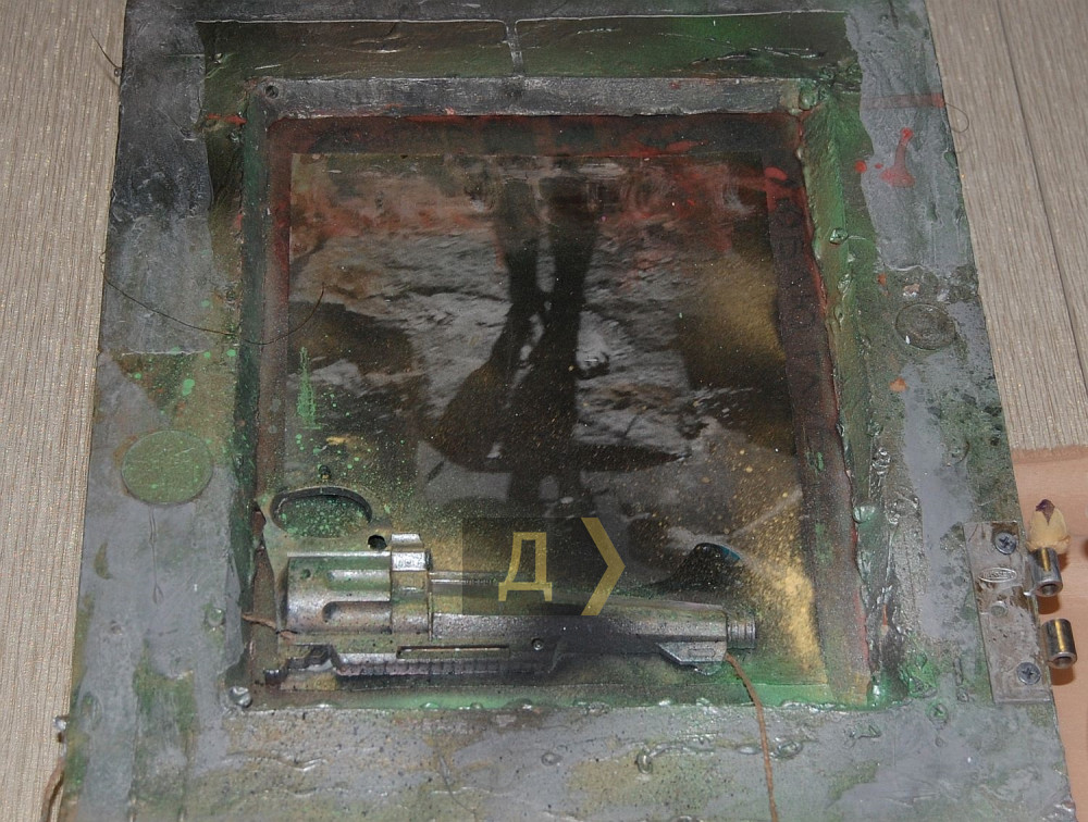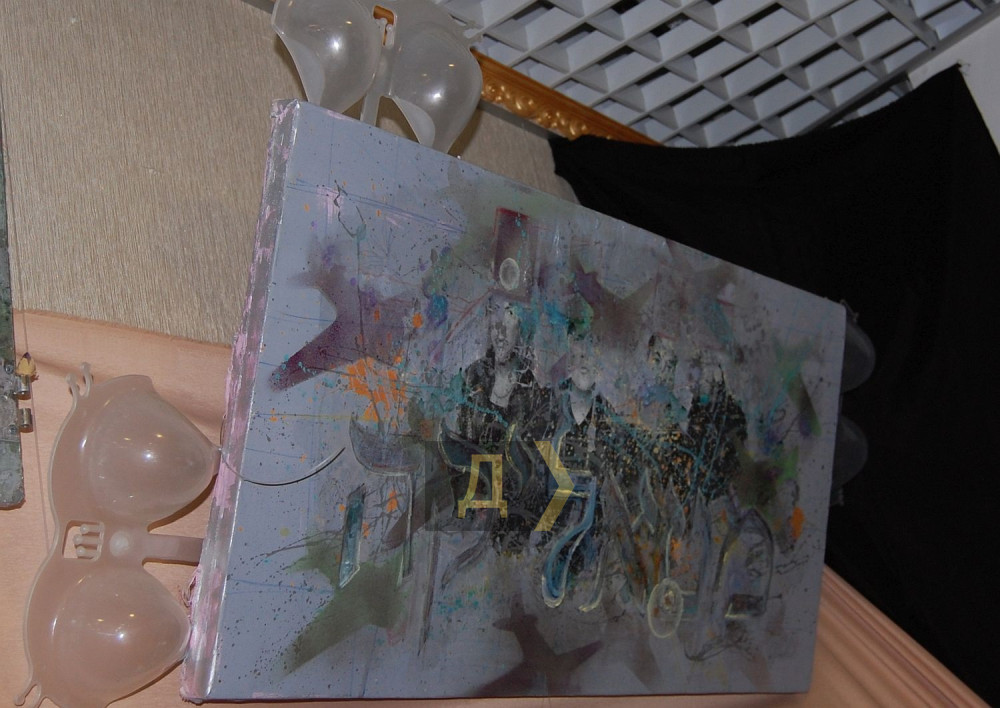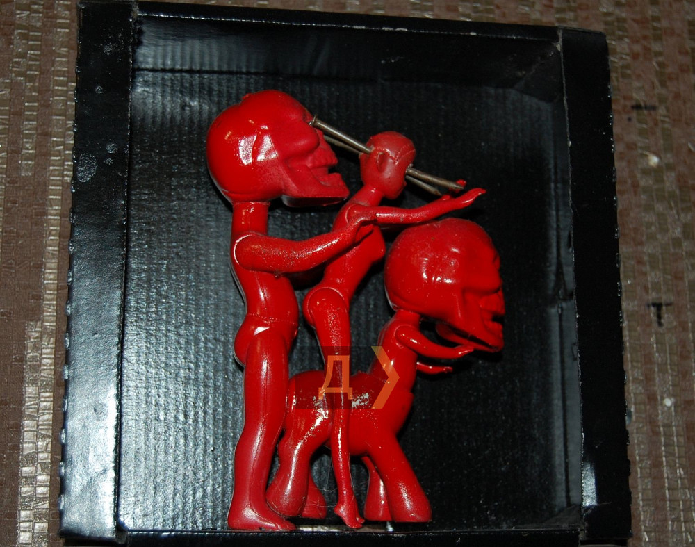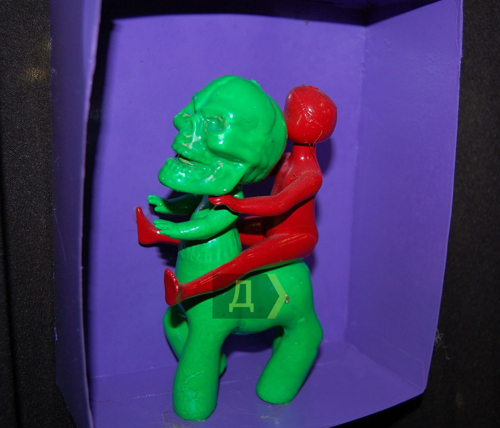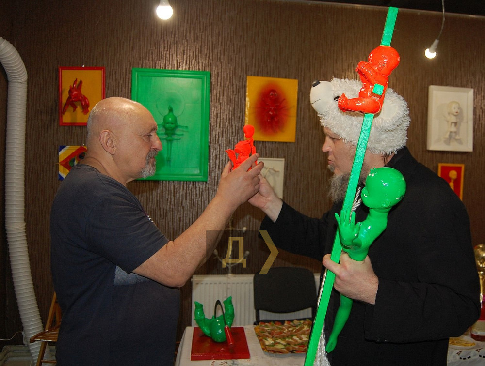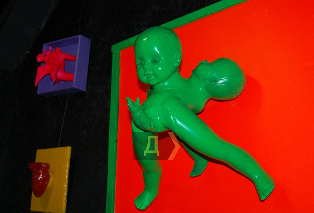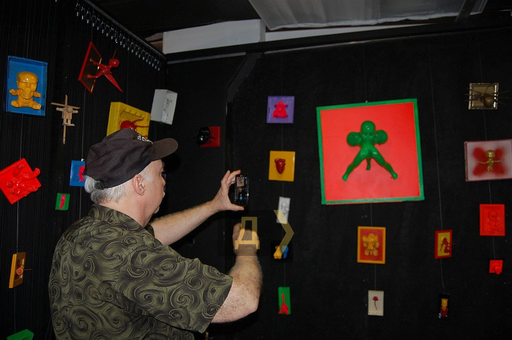 «Смотрите, вот работа «Измена 3D», — ведет экскурсию автор. – Один чувак застал другую с третьим, и вот он в шоке лежит и офигевает. Работа интерактивная, фигурку можно вытащить. Пока особо нет работы, можно уделить внимание творчеству и провести персональную выставку, чему я очень рад».