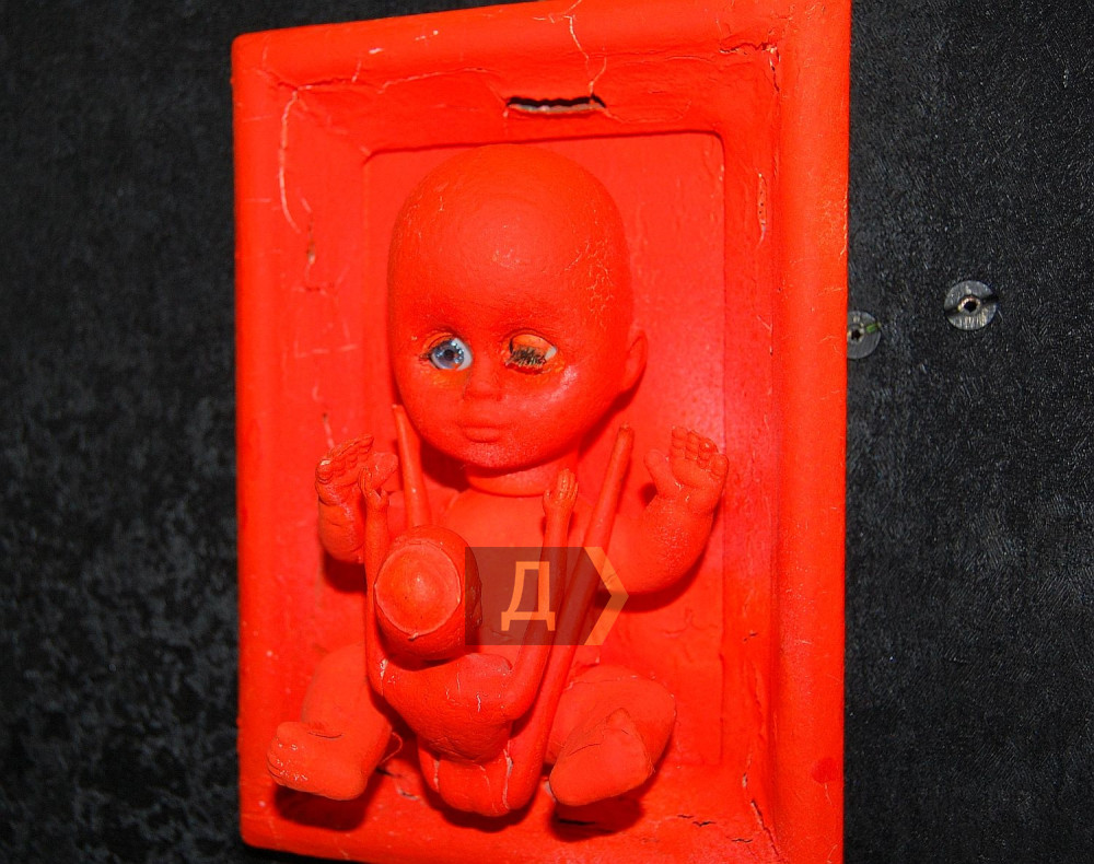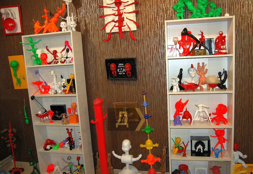 В зале представлены несколько циклов произведений, но вразброс, произведения расположены по цвету, красный арт-объект не соседствует с зеленым, например. Есть цикл «Я – Бог», «Бог есть любовь», «Два друга и Кали-Юга», «Всадники Апокалипсиса» (один из всадников, между прочим, порождает «Кровавое дитя Анархии»). «Леденящая душу славяноведическая Коряга Смерти», «Красный кхмер – всем пример», «Смерть любит тебя», «Голова, не уходи» — всего 218 арт-объектов обычно проживают в комнате художника, где, по его словам, происходит постоянное шевеление.