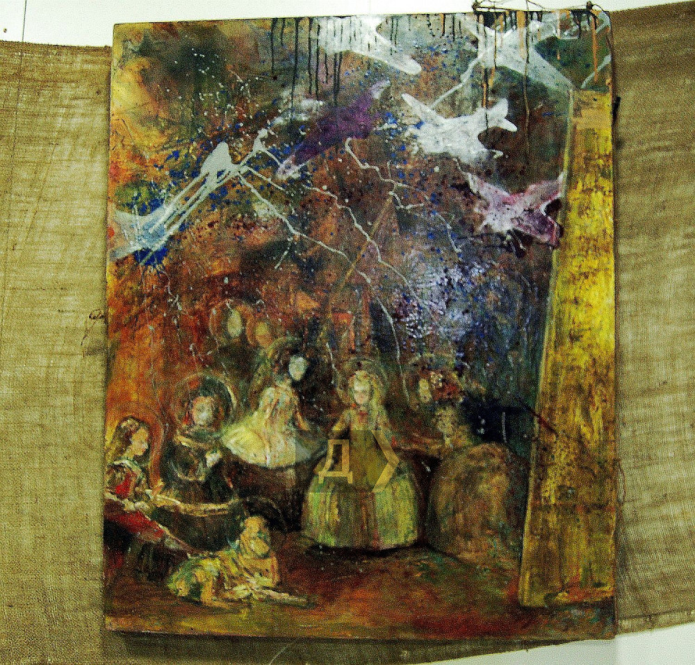 «Я использовал зеркало, — признается художник. — Известно, что Веласкес писал свою картину по зеркальному отражению, в котором видел и себя. Это исторический факт. А я стремлюсь показать идентичную картинку, обратный вариант всемирно известной работы, все перевернул. Так все выглядело на самом деле. И, конечно, я внес свои коррективы. Наверху очень обширное пространство, хотелось чем-то заполнить такую глубину и высоту. Приходили разные мысли в процессе работы, хотелось сделать летающую тарелку, потом пришел к самолетам, использовал трафареты, как в стрит-арте, задул красками. Получился актуальный акцент: мирный королевский испанский двор и кружащийся над ним самолет… Контрасты привлекательны в живописи, но они должны нести и гармонию, считаю, что с поставленной задачей справился».