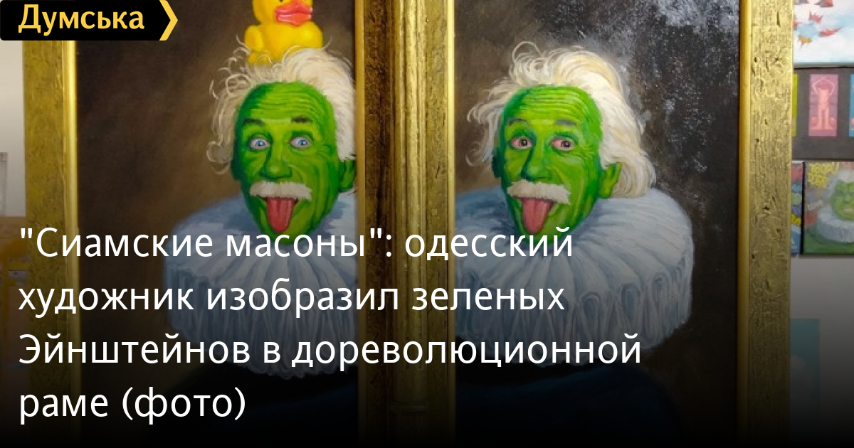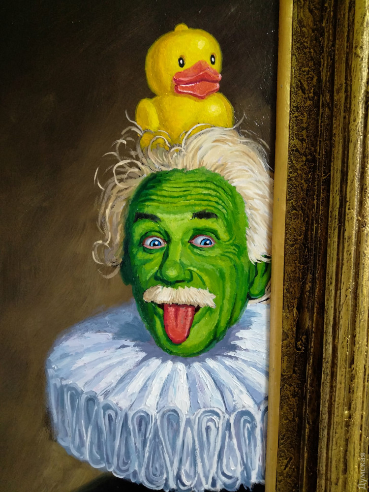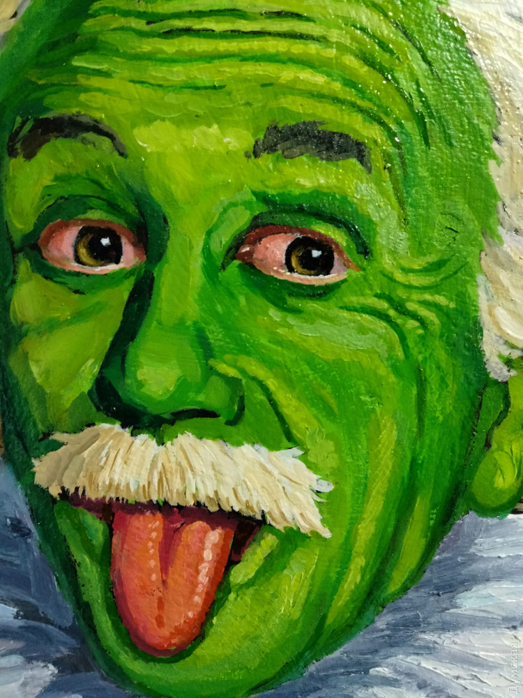 Портрет двоих зеленоликих Альбертов Эйнштейнов мастер поместил в резную дореволюционную оконную раму, которую выбросил в мусорный бак какой-то житель переулка Маяковского.