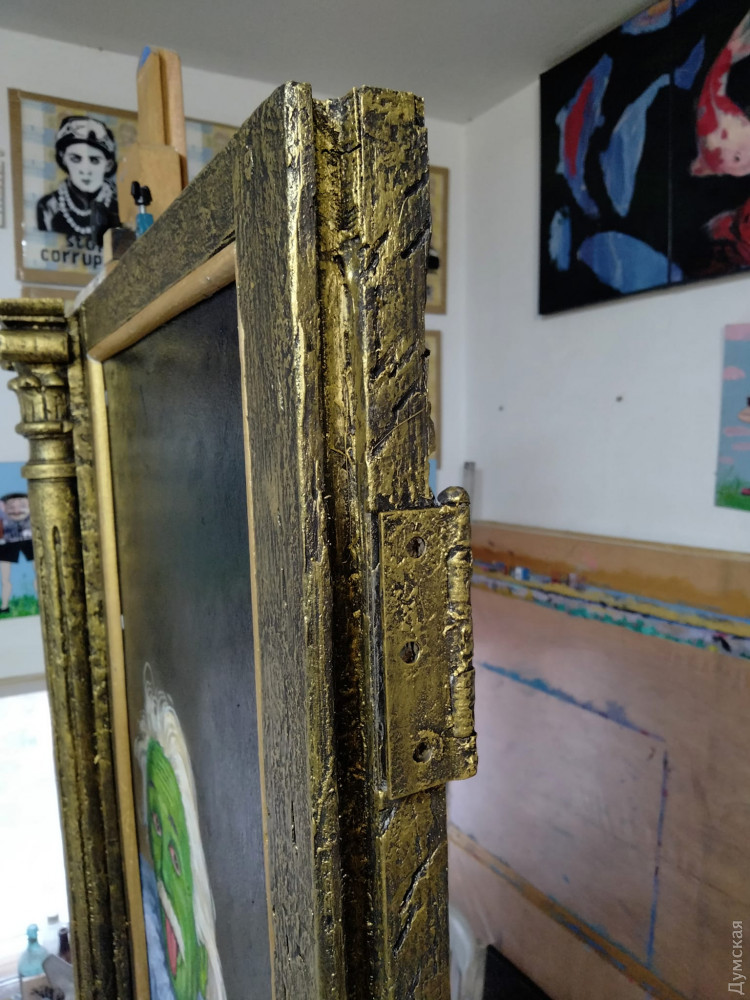 «Сейчас, к сожалению, мало уделяют внимания сохранению старых окон, — рассказал «Думской» Кирилл. — Просто меняют на металлопластик, а резные, исторические рамы выкидывают. В городе осталось от силы 3% домов с нетронутыми рамами. Эту я нашел прошлой зимой. Внутреннюю створку с очень красивым шпингалетом я использовал для другой картины — одесский виноград, вьющийся по одесскому балкону и присыпанный первым снегом. До внешней рамы вот только руки дошли. Привел ее в порядок и решил нарисовать какую-то знаковую личность. Яркую».
