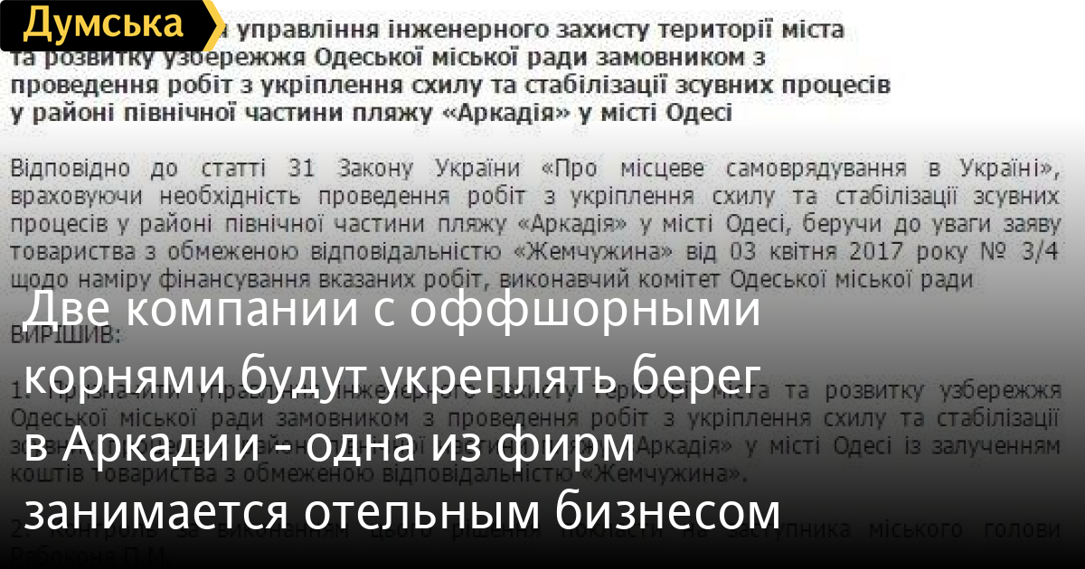 Вторая компания имеет прописку на Виргинских островах — «Маджика Сервисес Лимитед». Эта фирма намерена профинансировать проведение работ по капитальному ремонту берегоукрепления № 1, расположенного в южной части пляжа «Аркадия» между траверсами № 2 и № 3 второй очереди противооползневых сооружений.