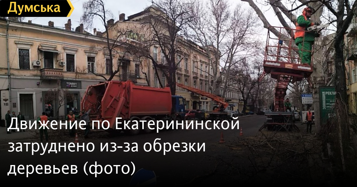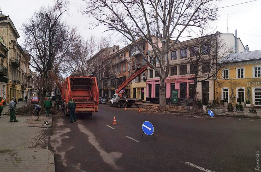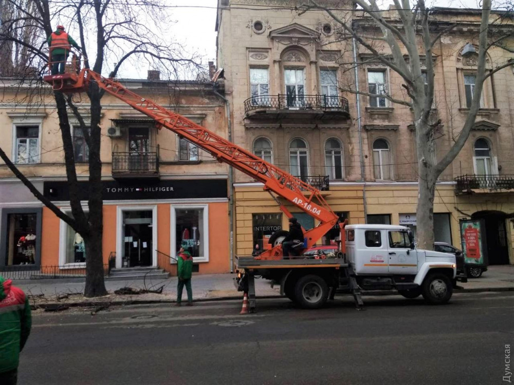 Санитарная обрезка зеленых насаждений продолжается на Екатерининской улице Одессы.