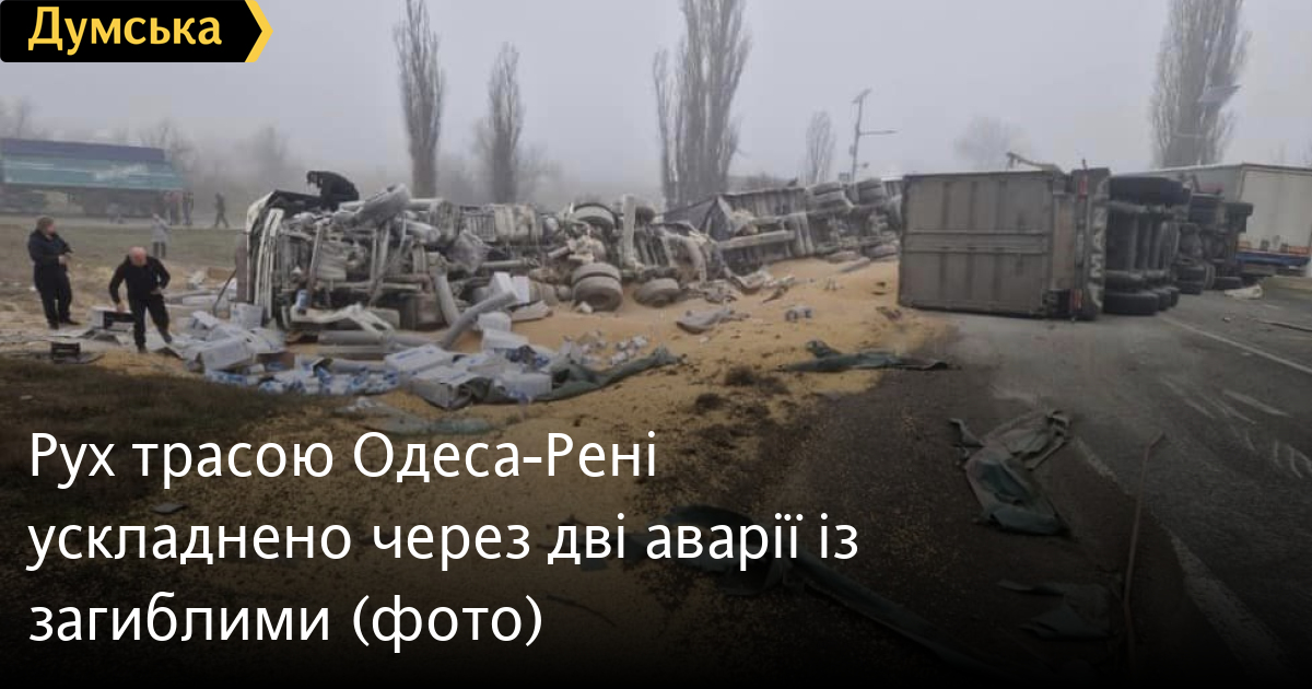 Рух трасою Одеса-Рені ускладнено через дві аварії із загиблимиОдразу дві аварії зі смертельними наслідками сталися сьогодні на автомобільній дорозі Одеса-Рені. Як повідомили в поліції, загинуло троє водіїв вантажівок. Одна ДТП сталася біля села Нові Трояни, друга — біля селища Суворове Ізмаїльського району. У районі Нових Троян 45-річний житель Миколаївської області, який прямував на фурі Volvo в Ізмаїл, не впорався з керуванням. Машина перекинулася, шофер помер до приїзду швидкої. Друга ДТП сталася дві години потому. Водій вантажівки DAF із напівпричепом, який їхав в Ізмаїл, вискочив на зустрічну смугу і зіткнувся з такою самою фурою. Обидва шофери загинули. Рух трасою ускладнено. «Звертаємо увагу водіїв, що наразі рух біля села Холмське в напрямку на Ізмаїла здійснюється в реверсивному режимі, — зазначає Служба автодоріг Одеської області. — Рух біля Суворового здійснюється однією смугою, частково узбіччям. Просимо водіїв планувати маршрут своєї поїздки з урахуванням цієї інформації та дотримуватися правил дорожнього руху». СМЕРТЬ РОСІЙСЬКИМ ОКУПАНТАМ! Помітили помилку? Виділяйте слова з помилкою та натискайте control-enter Новини по цій темі: 30 серпня 2025: Машина вилетіла в кювет: мер Рені потрапив в аварію, його мати загинула, а маленький син у лікарні (фото) 18 серпня 2025: Троє загинули, один у лікарні: на трасі Одеса-Рені водій Mercedes не пропустив фуру (фото) 28 липня 2025: П'яний на "Ягуарі" або гіпертонік? Звільнений топ-посадовець одеської поліції хоче повернутися на службу 2 квітня 2025: В Одесі водій BMW спровокував аварію, в якій постраждали п`ятеро людей, і втік (фото, відео) |