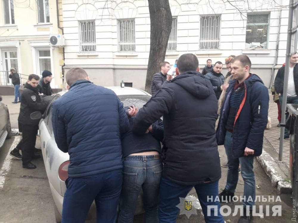 Отняв у предпринимателя 20 тысяч долларов, двое разбойников пытались убежать с места преступления мимо здания Главного управления полиции в Одесской области на Еврейской улице.
