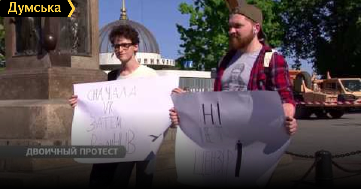 Одесситы выступают против запрета российских соцсетей и поисковых систем. На митинг к памятнику Дюку пришли двое протестующих.