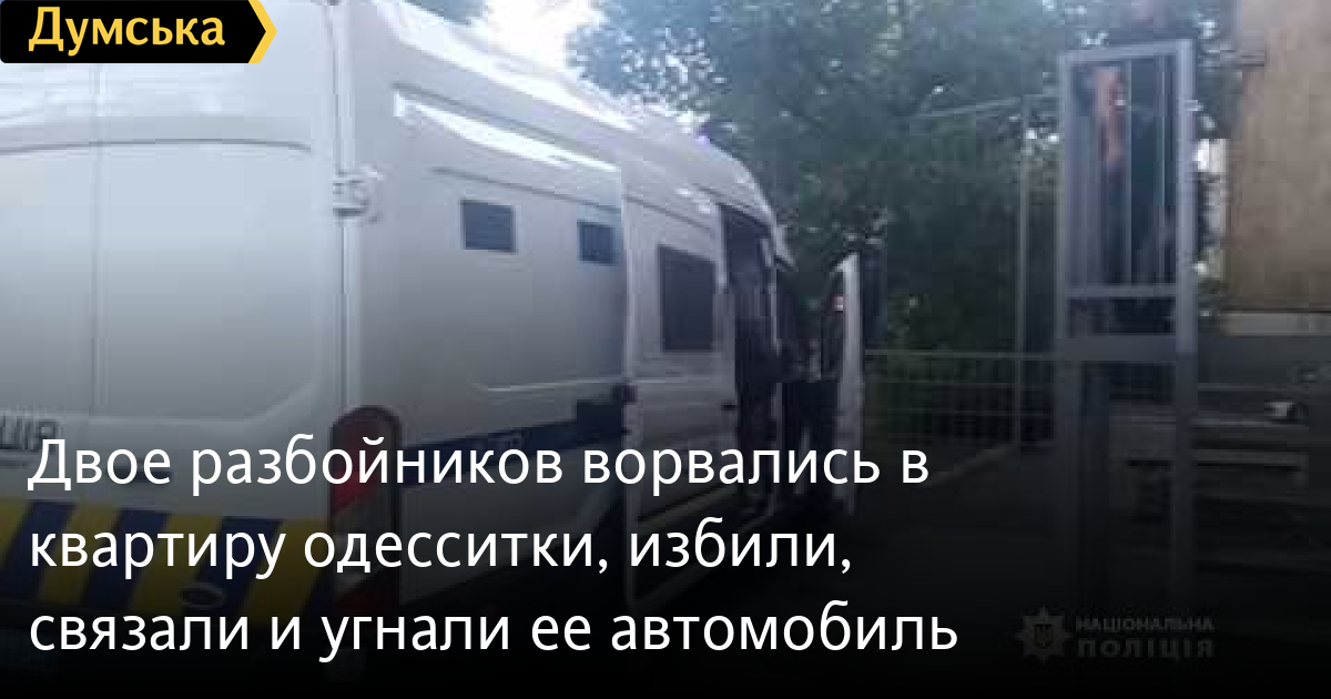 Как сообщили в ГУНП, инцидент произошел в Суворовском районе. Сообщники поджидали женщину у дверей ее квартиры рано утром, а когда та вышла — затолкали ее вовнутрь, избили, связали, после чего завладели золотыми украшениями, телефонами, планшетом, документами и ключами от автомобиля Toyota. Автомобиль забрали на стоянке возле дома и на нем же скрылись с места происшествия. Общая сумма похищенного имущества — около 100 тысяч гривен.