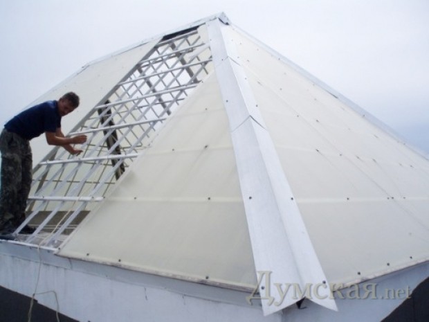 Сотрудники горуправления охраны памятников и городского УКСа провели «первоочередные противоаварийные работы» — прикрыли дыру пленкой.