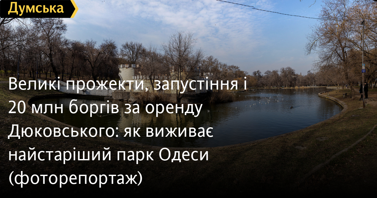 У 2010 році мерія Одеси віддала Дюковський сад в оренду компанії «Катюша», яка обіцяла перетворити його на сучасну рекреаційну зону: готель, торговий центр, планетарій, парк динозаврів. Усі великі прожекти залишилися лише в уяві їхніх авторів. «Катюша» уклала з містом типовий договір оренди землі (ми два тижні чекали від мерії його копію, в принципі чекаємо й досі). Минуло 14 років. Парк руйнується, а компанія заборгувала місту 18,5 млн грн. Суд стягнув із приватників 789 грн. Ми пройшлися занедбаними доріжками, вивчили судові рішення, згадали обіцянки та спробували розібратися, чому колись популярна, найстаріша в Одесі, зелена зона перетворилася на заросле болото з розбитими будівлями. ЯК ЗАРАЗ? Попри грандіозні плани «Катюші» на кшталт будівництва готелю і торгово-розважального центру посеред зеленої зони (про це ми розповімо нижче), всі ці роки комерсантів вистачало тільки на те, щоб перездавати частини парку в суборенду та зрідка чистити ставок. Фасадний вхід з боку Балківської зустрічає відвідувачів незвичайною інсталяцією — три секції паркану (без початку і кінця) самотньо стоять біля краю тротуару. Тут варто нагадати, що 2023 року адміністрація парку почала обносити його огорожею. Роботи стартували у віддаленій частині на Розкидайлівській вулиці й , як це часто буває в Одесі, стали елементом недобросовісної конкуренції, що призвела до закриття кав'ярні. У 2020 році під тиском мерії «Катюша» навела в парку легкий марафет: трохи прибралася, почистила замулені ставки, поклала плитку навколо малого ставу і встановила інформаційні таблички з ескізами майбутнього благоустрою. Усе намальоване на інформаційних щитах: ресторани, дитячі майданчики тощо — так і не було реалізовано. У частині парку, що залишилася, дорожнього покриття немає взагалі, асфальтні стежки вкриті тріщинами та вибоїнами. Пересуватися ними з коляскою — сумнівне задоволення. Зовнішній вигляд будівель, зведених 70 років тому до сільськогосподарської виставки, не витримує жодної критики. Колись на верхньому майданчику парку, перед будівлею з колонами, росли строгими геометричними візерунками, як в англійських парках, самшитові кущі. Кілька років тому рослини знищили комахи-шкідники. Висадити нові сил в адміністрації парку не вистачило. Навіть замінити на флагштоку державний прапор, що обтріпався по краях, руки не доходять. Ось уже багато років стоїть занедбаною і не використовується мальовнича фортеця на острівці великого ставка — колись там була кафешка. Сама водойма перебуває в жалюгідному стані. У кількох місцях бетонні борти пішли на дно, вода потихеньку підмиває берег. З позитивних вражень — хіба що розмаїття птахів, які обмилували водну гладь. БЛАГОУСТРІЙ ЧИ ЗАБУДОВА? ЯК ЗМІНЮВАЛИСЯ ПЛАНИ «КАТЮШІ» Комерсанти багато років намагалися реалізувати на території парку різні розробницькі проєкти різного ступеня масштабності (або, часом, фантастичності). У 2010 році «Катюша» залучила до розробки проєкту турецького архітектора Мурата Кадера. Зодчий представив своє бачення майбутнього парку на засіданні містобудівної ради при муніципальному управлінні архітектури. Турок пропонував відновити ставки, побудувати планетарій, парк динозаврів і кафе, а ще двоповерховий паркінг на 380 машиномісць і, куди ж без них, готель з офісними центрами. Вартість реалізації проє
