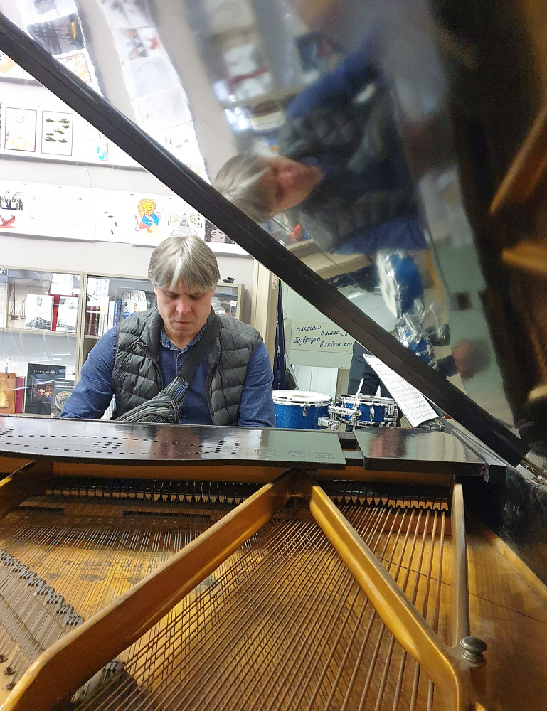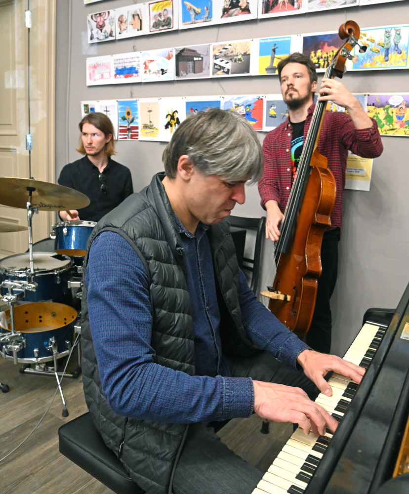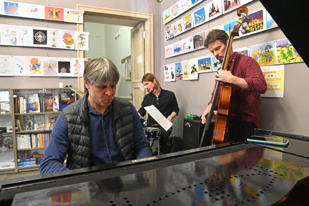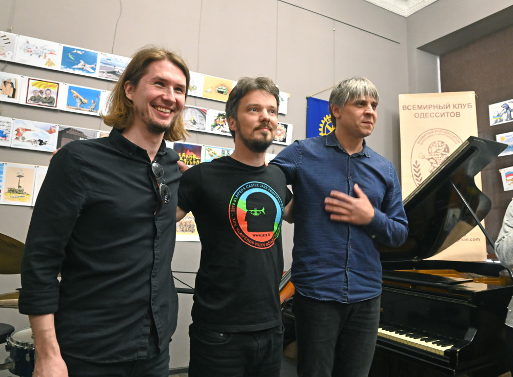 На благотворительном концерте выступили Вадим Бессараб (рояль), Максим Кондратьев (контрабас) и Яков Тарунцов (ударные). А представляла джазменов залу музыковед Елена Шевченко.