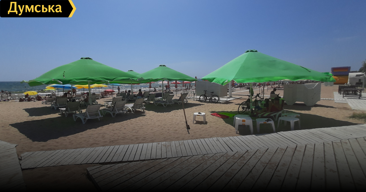 В этом году здесь появились муниципальные навесы, возле которых красуются плакаты с надписями «Муниципальный пляж. Услуги: шезлонги, зонты бесплатные». Вот только услуги на деле вовсе не бесплатные — в реальности шезлонг без навеса обойдется вам в 50 гривен, а под навесом — 100 гривен.