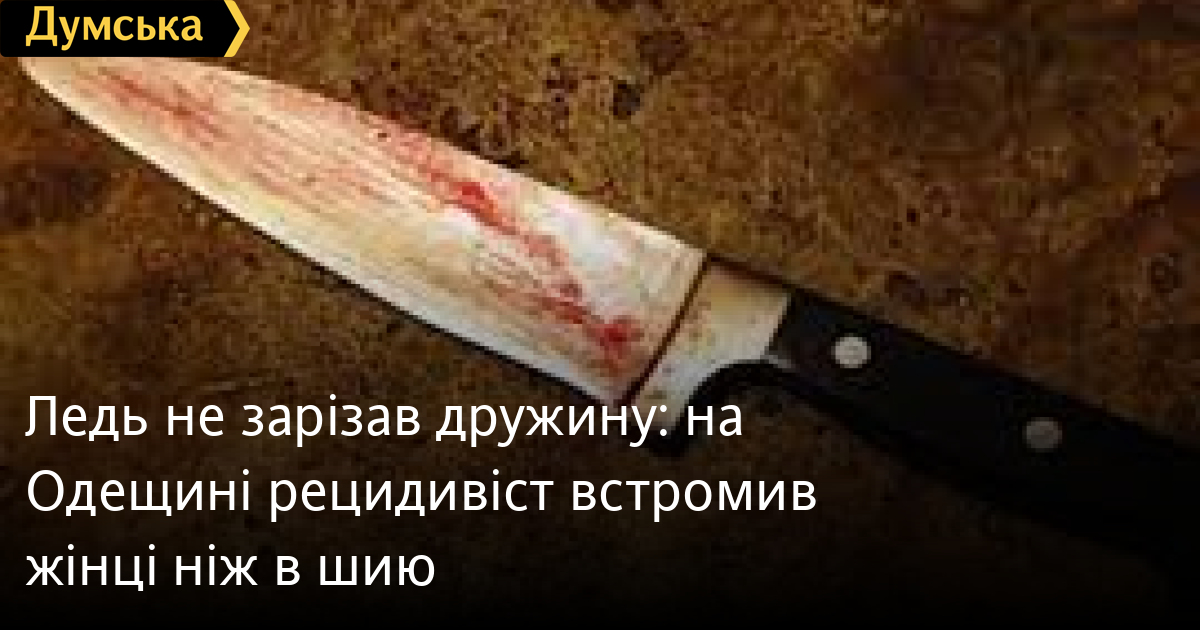 Ледь не зарізав дружину: на Одещині рецидивіст встромив жінці ніж в шиюМешканець Кілії мало не зарізав власну дружину, вдаривши її ножем у шию. Жінку госпіталізували у важкому стані, повідомили в поліції регіону. Подія сталася опівдні у неділю. 50-річний чоловік прийшов додому п'яний, чим дружина була незадоволена. Під час сварки нападник схопив зі столу ніж і вдарив її в шию. Поліцію та швидку допомогу викликала донька потерпілої. Медики госпіталізували жінку у важкому стані до Одеської обласної клінічної лікарні, а поліцейські затримали чоловіка. З місця злочину вилучили ніж та інші речові докази, які скерували на експертне дослідження. Зловмиснику повідомили про підозру у незакінченому замаху на умисне вбивство, тобто на умисне протиправне заподіяння смерті іншій людині. Йому загрожує до п'ятнадцяти років ув'язнення. Рецидивіста відправили до СІЗО. Триває слідство. Судитимуть чоловіка не вперше – він уже відбував покарання за умисне вбивство. СМЕРТЬ РОСІЙСЬКИМ ОКУПАНТАМ! Помітили помилку? Виділяйте слова з помилкою та натискайте control-enter |