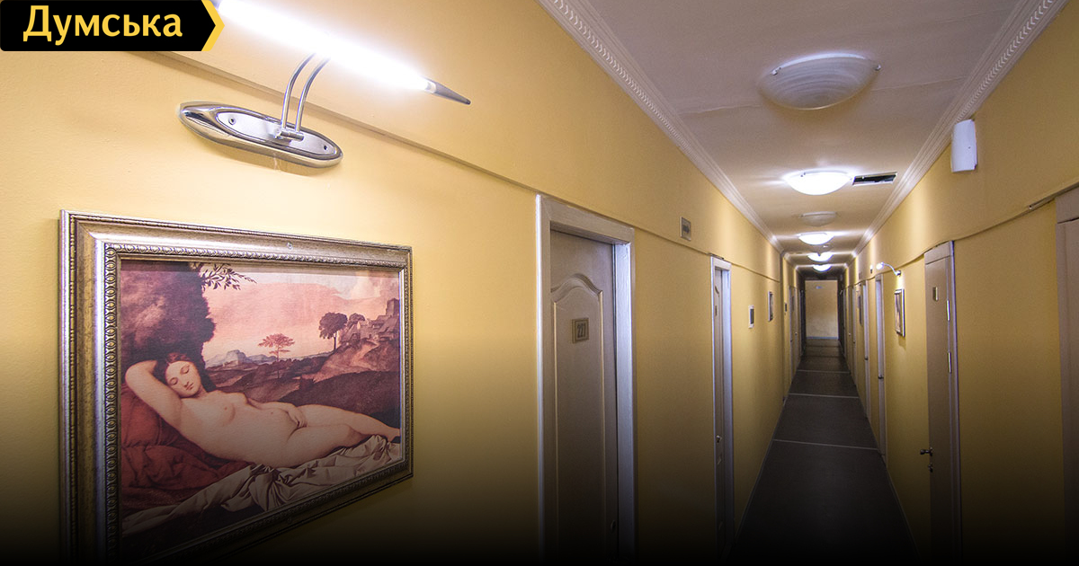 Мы поднимаемся на один из «спецэтажей». Здесь тематические репродукции с рембрантовскими голыми девами и узкий коридор, по обеим сторонам которого теснятся двери.
