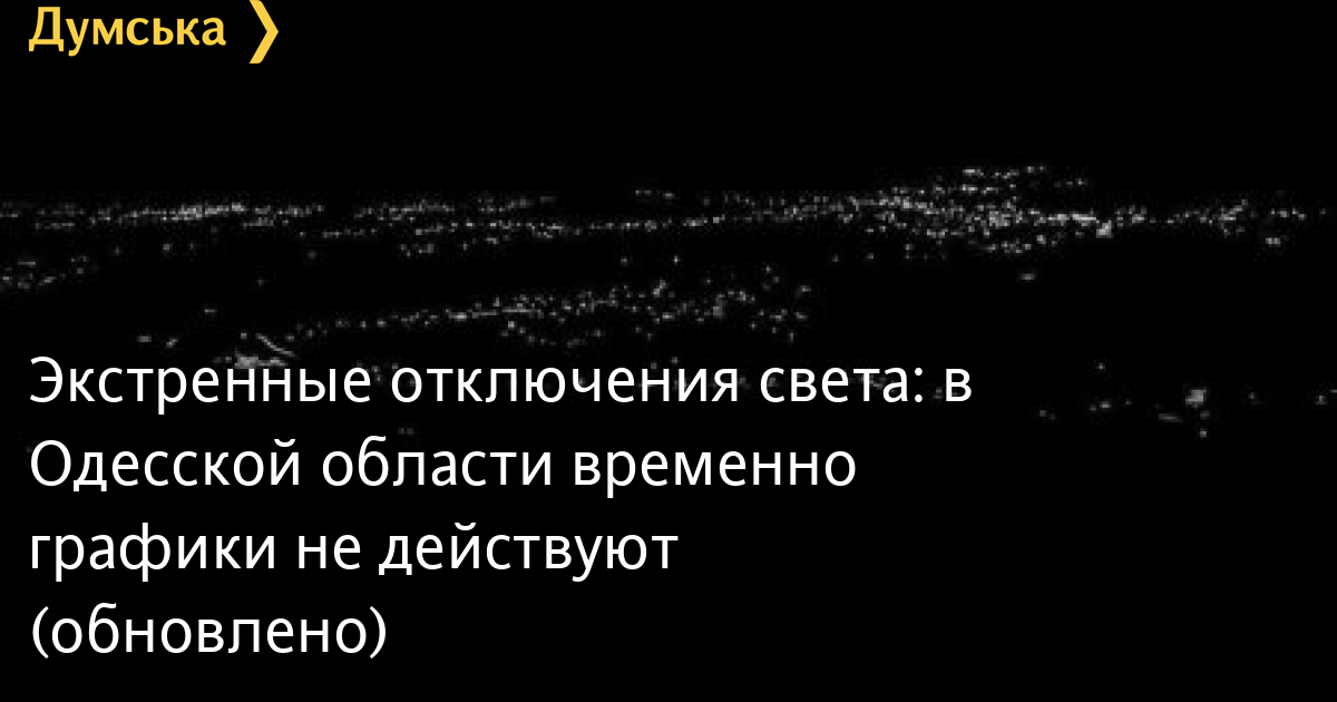 Екстрені відключення світла: в Одеській області тимчасово графіки не діють (оновлено)Екстрені відключення світла ввели в Одеській області за командою Укренерго. Як повідомили ДТЕК, через складну ситуацію в енергосистемі. На цей період графіки не діють. Також аварійні відключення застосували у Дніпропетровській, Київський областях та у столиці. ОНОВЛЕНО О 17:52. Графіки повернули. Екстрені відключення світла скасували. СМЕРТЬ РОСІЙСЬКИМ ОКУПАНТАМ! Помітили помилку? Виділяйте слова з помилкою та натискайте control-enter |