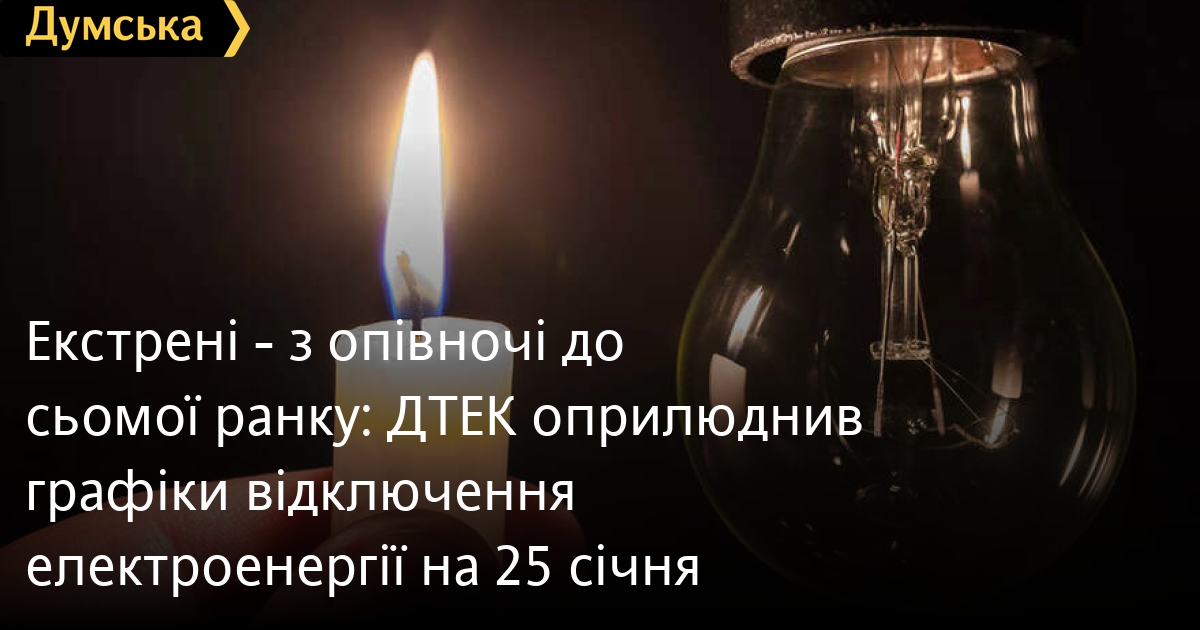 Екстрені — з опівночі до сьомої ранку: ДТЕК оприлюднив графіки відключення електроенергії на 25 січня