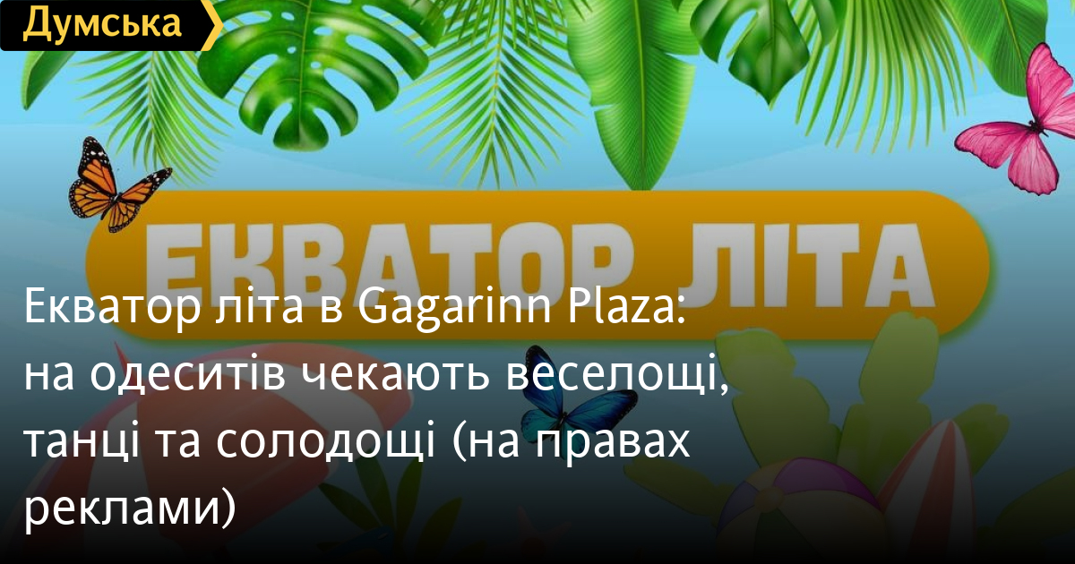 Екватор літа в Gagarinn Plaza: на одеситів чекають веселощі, танці та солодощі (на правах реклами)Одеситів запрошують на святкування екватора літа 18 липня в Gagarinn Plaza! На вас чекає яскравий день, сповнений сонця, веселощів та літнього настрою! Анімаційна програма — ігри, жарти та розваги з аніматорами! Святкова дискотека — запальні танці під улюблені хіти! Солодкий сюрприз — частування для кожного учасника! Не пропустіть можливість провести середину літа весело та смачно!