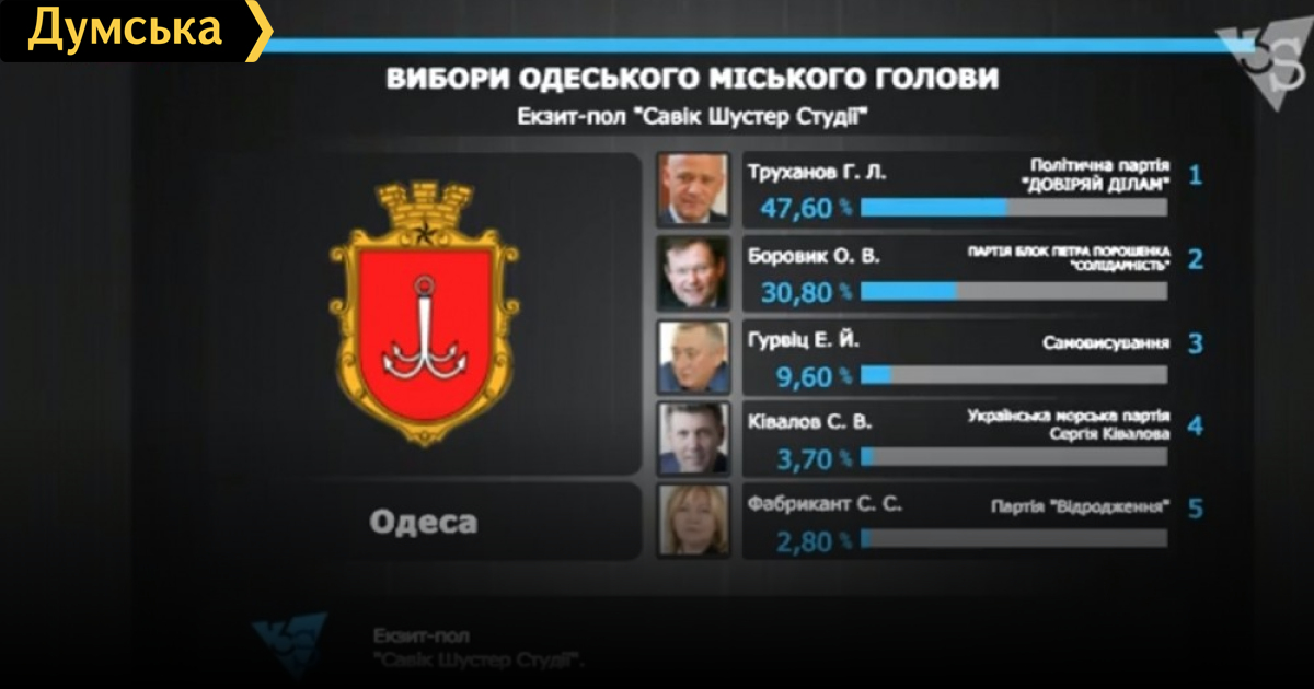 Данные экзитпола от студии Савика Шустера. В Одессе кандидат в мэры Геннадий Труханов набирает 47,6% голосов, на втором месте — Александр Боровик с 30,8%. Третий — Гурвиц с 9,6%. Четвертый и пятый — Кивалов и Фабрикант.