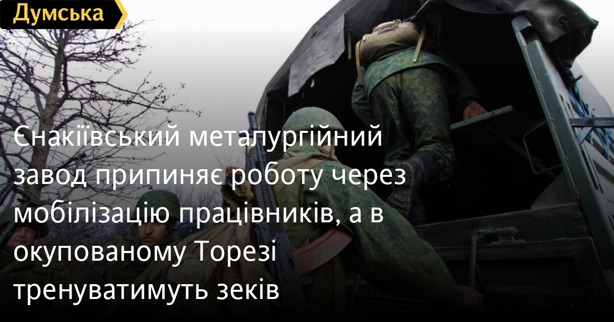 Влада «днр» скасувала дію раніше виданих документів про відстрочку/звільнення від мобілізації та планує «призвати» від 200 до 500 працівників Єнакіївського металургійного заводу. Через нестачу персоналу виробництво на заводі «тимчасово призупиняється».