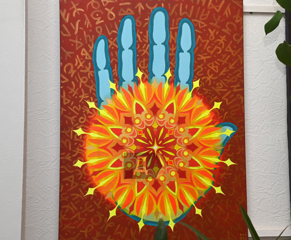 «Тут зображений яскравий диск небесного світила, це не місяць і не сонце. Важливо, як ви це бачите, це може бути захід сонця, може бути світанок. Найголовніше в цій картині — ієрогліфи, що несуть якусь інформацію. Повний місяць розпаковує в кожному з вас божественну природу, вивільняє творця. Якщо ви будете медитувати частіше, прийде усвідомлення того, що відбувається, і мої картини — трансформаційні, дивлячись на них, медитуючи на них, зможете швидше розпаковувати свої сакральні знання», — впевнена художниця.