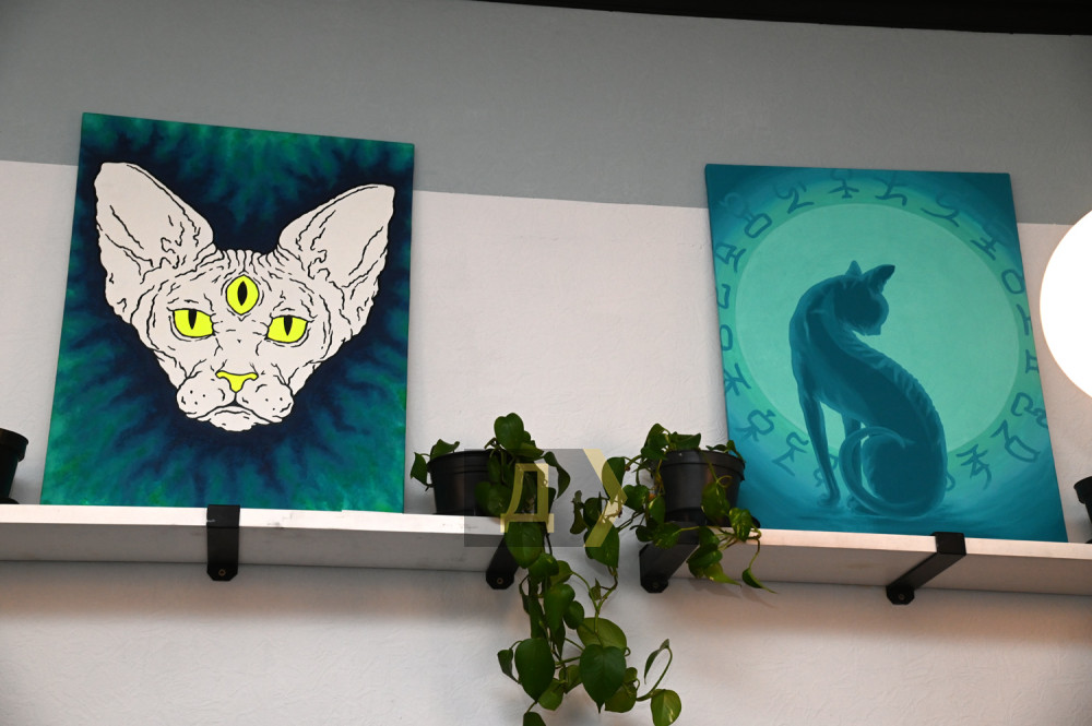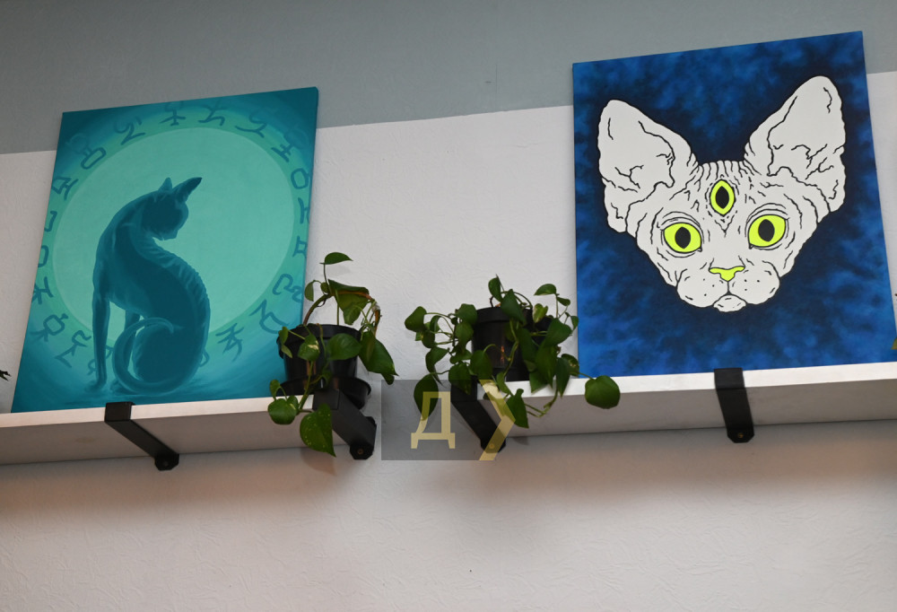 Уже знайомі нам за попередньою Асиною виставкою (ми про неї писали тут) «Космічний пес» і коти-сфінкси, які мають третє око (два ока, щоб дивитися, третє — щоб бачити), зверхньо дивляться на решту експозиції та глядачів.