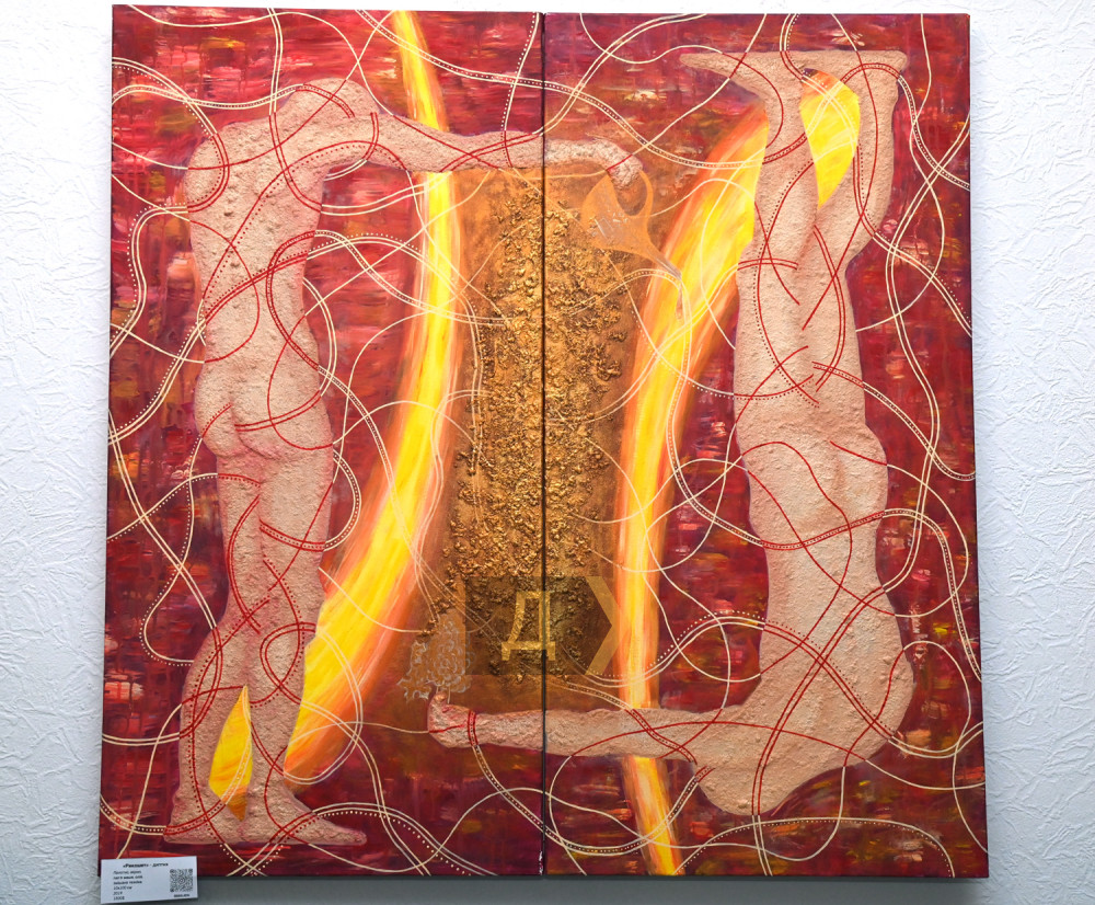 «Картина «Рикошет» створена 2019 року, — завершує Ася авторську екскурсію своєю виставкою. — Тут зображені близнюки, але це не зовсім так, зафіксовано жест того, хто бере і дає, циклічний процес: коли ми щось віддаємо, нам щось повертається. Картина врівноважена, несе енергію взаємодії. Якщо придивитися, видно, що один із близнюків поливає водою з лійки, а інший подає йому грона винограду. Усі лінії, що проходять через роботу — це енергії, які пронизують простір. Впевнена, кожна моя картина служить оберегом власнику і приносить тільки позитив».