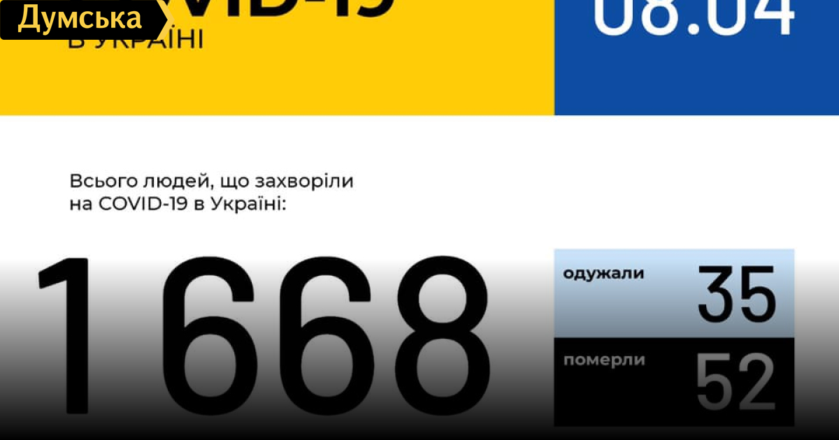«По состоянию на 9 утра 8 апреля в Украине лабораторно подтверждено 1668 случаев заражения коронавирусной инфекцией.»
