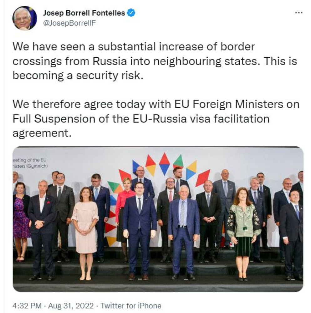 «Ми спостерігаємо значне збільшення перетину кордону з росії до сусідніх держав. Це стає загрозою безпеці», — заявив голова європейської дипломатії Жозеп Боррель.