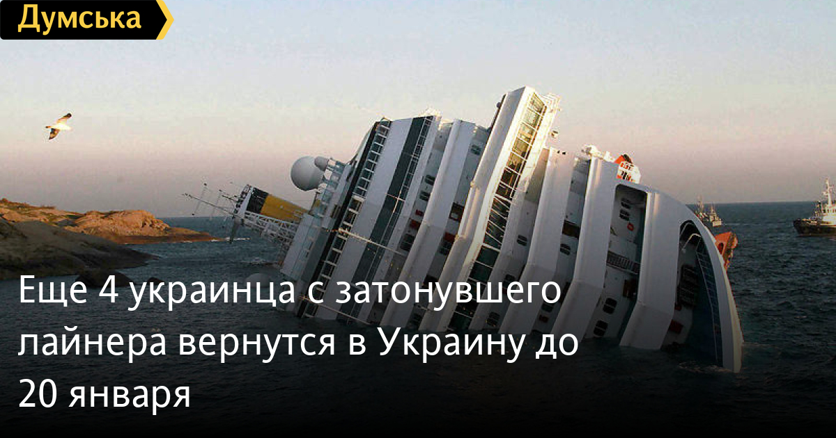 В Министерстве иностранных дел Украины сообщают, что 4 гражданина Украины, которые находились на затонувшем круизном лайнере «Costa Concordia», вернутся на родину 16 и 20 января текущего года, передает «Интерфакс-Украина». Согласно информации, 15 января 27 из 35 граждан Украины, находящихся на этом судне, прилетели в Киев. Сразу же после прибытия дипломаты МИД их встретили в аэропорту и посодействовали в дальнейшей отправке в Одессу, Симферополь, Львов и Харьков. Еще 4 украинца по собственному желанию были отправлены в города Реджио Калабрия и Барселона по месту своего временного жительства. Как сообщалось, круизный лайнер «Costa Concordia», на борту которого находились более 4,2 тыс. человек, в ночь на 14 января сел на мель близ острова Джильо у побережья итальянской области Тоскана, после чего затонул. По последним данным, 6 человек погибло, около 15 считаются пропавшими без вести. В МИД Украины подтвердили информацию о 35 спасшихся с «Costa Concordia» украинцев. СМЕРТЬ РОССИЙСКИМ ОККУПАНТАМ! Заметили ошибку? Выделяйте слова с ошибкой и нажимайте control-enter |