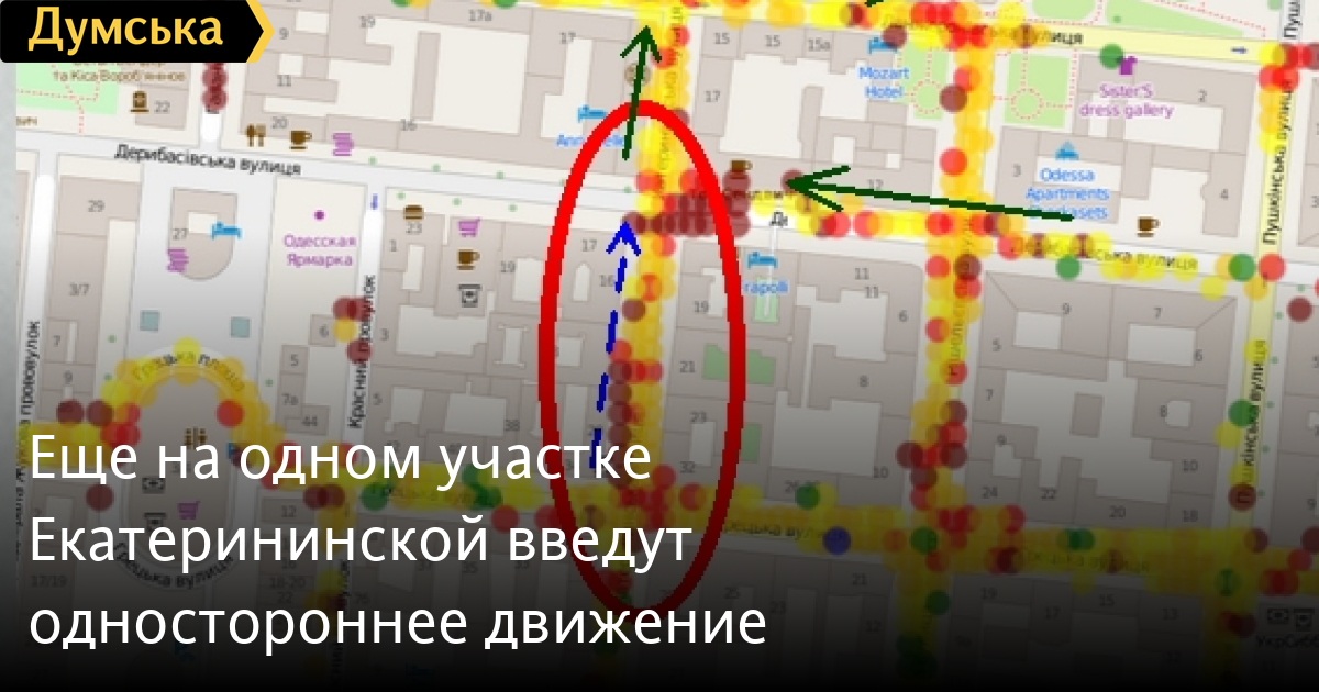 Организация движения в одну сторону позволит разгрузить квартал и избежать встречных разъездов, однако пока данный вопрос не прошел согласование с ГАИ. Дело в том, что сейчас на перекресток Дерибасовской и Екатерининской также выходит поток транспорта Дерибасовской (со стороны Ришельевской). Сейчас этот транспорт имеет пусть теоретическую, но возможность повернуть на Екатерининской налево. В случае принятия одобренного решения весь поток будет уходить на только направо, в сторону Ланжероновской.