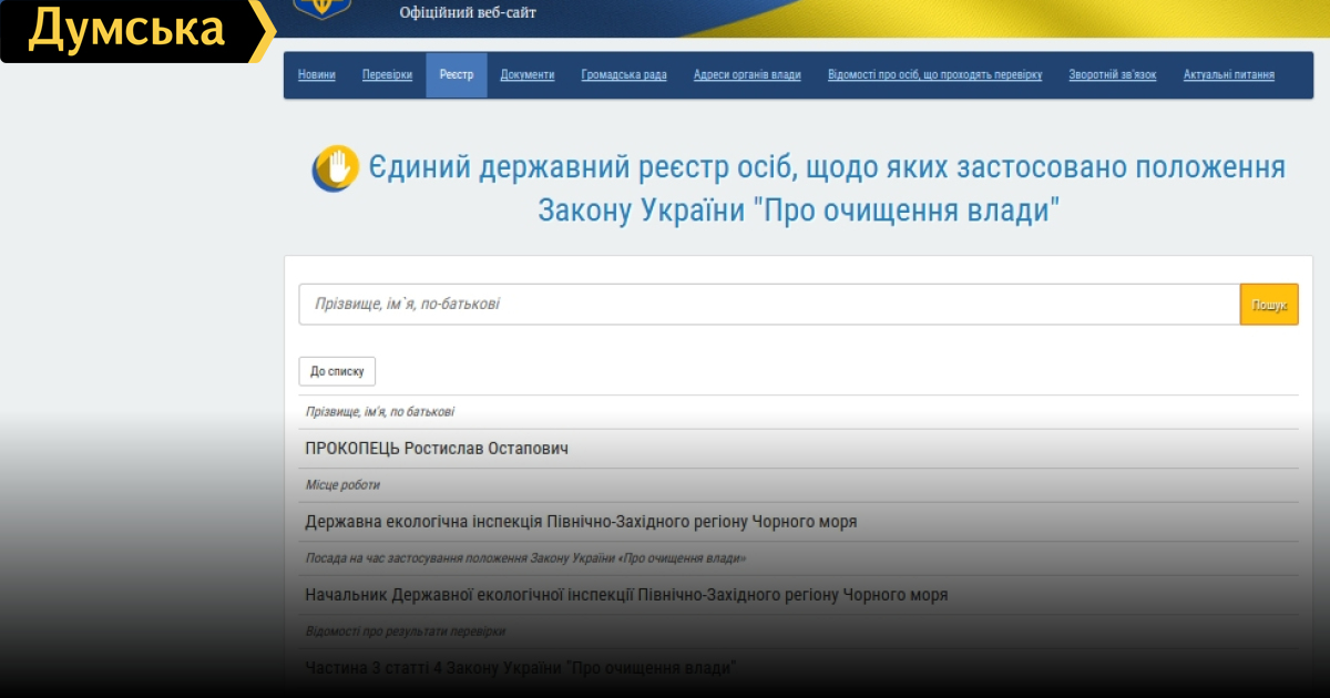 Ростислав Прокопец был назначен на должность начальника инспекции в октябре 2014 года. Поводом для увольнения стала неподача в установленный срок заявления о том, что на него не распространяются ограничения в соответствии с законом «Об очищении власти». Суд установил, что Прокопец написал и передал руководству такое заявление. Основанием для восстановления его в должности стал тот факт, что с 26 марта 2015 года чиновник находился на больничном. Вместе с тем, согласно реестру Министерства юстиции, Ростислав Прокопец подлежит люстрации и не имеет права находиться на госслужбе в течение 10 лет. Государственная экологическая инспекция обжаловала это решение, дело находится на рассмотрении в Киевском апелляционном административном суде. В настоящее время обязанности начальника экологической инспекции Северо-Западного региона Черного моря исполняет Вадим Терещук, кандидатура которого согласована в том числе главой ОГА Михаилом Саакашвили. Ранее восстановиться через суд пытался еще один люстрированный чиновник инспекции Юрий Кавун. Он также выиграл иск в суде первой инстанции, основанием для отмены приказа стала неправильно оформленная подпись руководителя. Апелляционная инстанция отменила это решение.