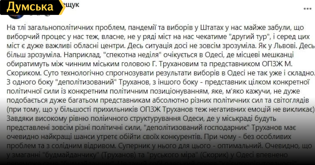 Украинский политолог, преподаватель КНУ им. Тараса Шевченко Петр Олещук на своей странице в Facebook написал, что в Одессе ожидается «жаркое» воскресенье, где местные жители будут выбирать между действующим городским главой Геннадием Трухановым и представителем ОПЗЖ Николаем Скориком.