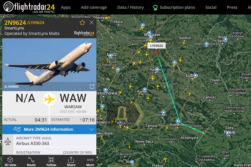 Пілот увімкнув транспондер о 04:36 UTC (07:36 за київським часом) — одразу після перетину польського кордону. Ще через 40 хвилин Airbus A330 здійснив посадку у варшавському аеропорту імені Шопена.