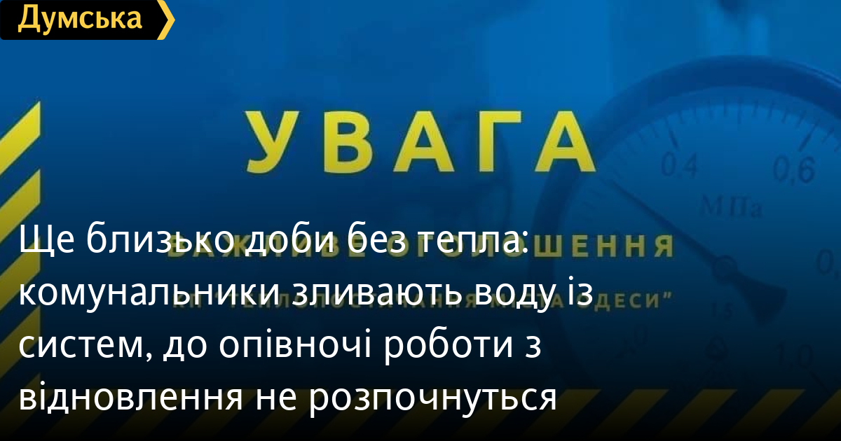 Ще близько доби без тепла: комунальники зливають воду із систем, до опівночі роботи з відновлення не розпочнутьсяЩе близько доби не буде тепла в будинках, які обслуговують котельні Південна-1 і Південна-2. Як повідомили «Думській» у «Теплопостачанні міста Одеси», на те, щоб батареї стали гарячими, знадобиться 24 години після відновлення електропостачання, а заживити обидві котельні обіцяють до кінця 19 лютого. Без опалення станом на зараз перебуває 489 житлових будинків, 13 дитячих садочків, 14 шкіл і 9 медичних установ. Фахівці «Теплопостачання міста Одеси» зливають воду з основних теплових мереж наземної прокладки. ЖКС роблять те саме з житлових і нежитлових будинків. Мерія звертається до голів ОСББ із проханням організувати у себе цей процес і тримати зв'язок з абонентським відділом Київського району. Зазначимо, внаслідок нічної атаки постраждали четверо людей, серед них дитина. Серйозних пошкоджень зазнали поліклініка, дитсадок і 24-поверховий житловий будинок. СМЕРТЬ РОСІЙСЬКИМ ОКУПАНТАМ! Помітили помилку? Виділяйте слова з помилкою та натискайте control-enter |