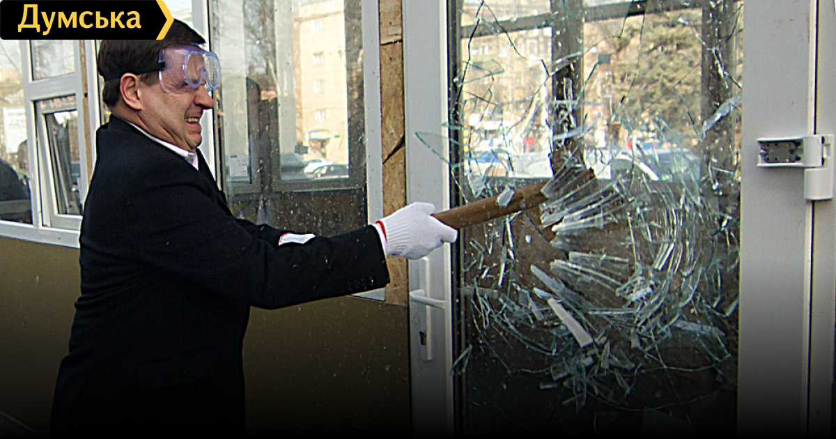 Сегодня около 16 часов мэр Одессы Алексей Костусев, сбежав с обсуждения проекта Генплана, показательно разгромил МАФ, который на днях установили прямо на ступеньках железнодорожного вокзала. На вокзал Алексей Костусев пришел в сопровождении солидной свиты — глав райадминистраций и сотрудников мэрии. Он надел защитные очки, перчатки и со словами «Давно хотел это сделать» кувалдой выбил окна в будке.